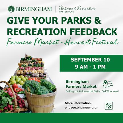 Join us at our last field event on Sunday, September 10 from 9 a m - 1 p m at the Birmingham Farmers Market, located in Public Parking Lot 6 at 660 North Old Woodward.