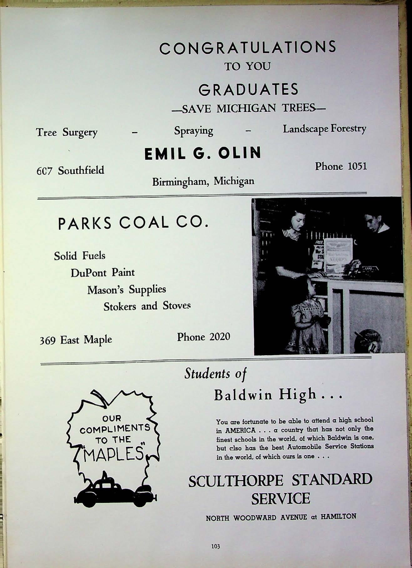 Tree Surgery 6G7 Southfield CONGRATULATIONS TO YOU GRADUATES -SAVE MICHIGAN TREESSpraying Landscape Forestry EMIL G. OLIN Phone 1051 Birmingham, Michigan PARKS COAL CO. Solid Fuels DuPont Paint Mason 's Supplies Stokers and Stove~ 369 East Maple OUR MPLIMEN TO THE ADLE Phone 2020 Students of Baldwin High ... You are fortunate to be able to attend a high school in AMERICA . . . a country that has not only the finest schools in the world, of which Baldwin is one, but clso has the best Automobile Service Stations in the world. of which ours is one • • • SCULTHORPE STANDARD SERVICE NORTH WOODWARD AVENUE at HAMILTON 103