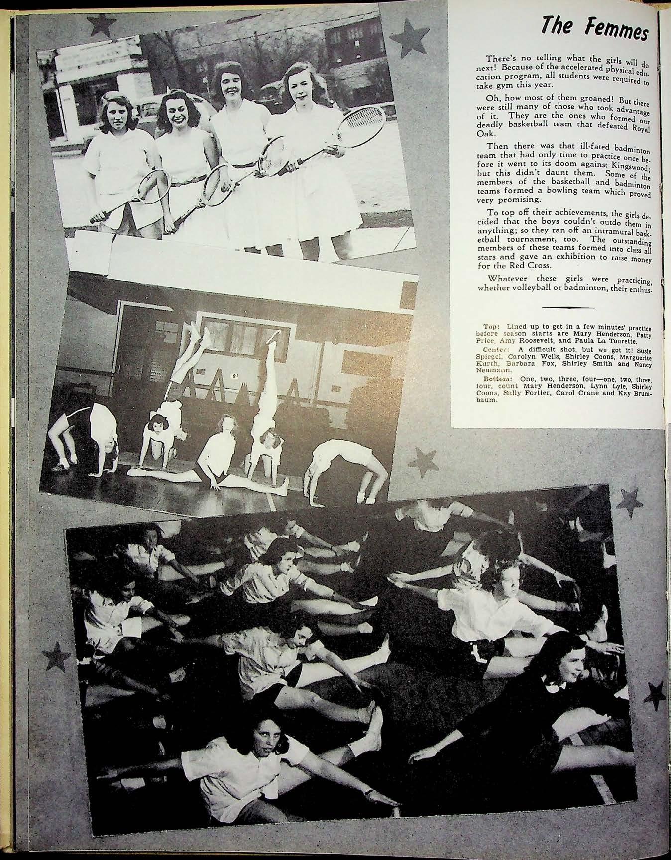 To meet the requirements of endurance and stamina set up by war• time training, a compulsory program of physical fitness wa s establi s hed rh is year. ln tho$e hours we may relax from the gr ind of the day .1nd yet learn how co co-ordinate our efforts with those of others. In additio n, we have been .lblc 10 keep our interscholastic' spores