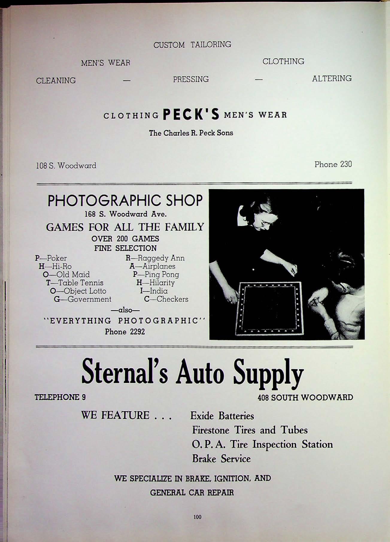 CUSTOM TAILOR ING M EN'S WEAR CLOTHING CLEANING PRESSING CLOTHING PECK'S MEN'S WEAR The Charles R. Pe ck Sons 108 S. Woodward PHOTOGRAPHIC SHOP 168 S. Woodward Ave. GAMES FOR ALL THE FAMILY OVER 200 GAMES FINE SELECTION P-Poker H-Hi-Ro 0 -0ld Maid T-Table Tennis