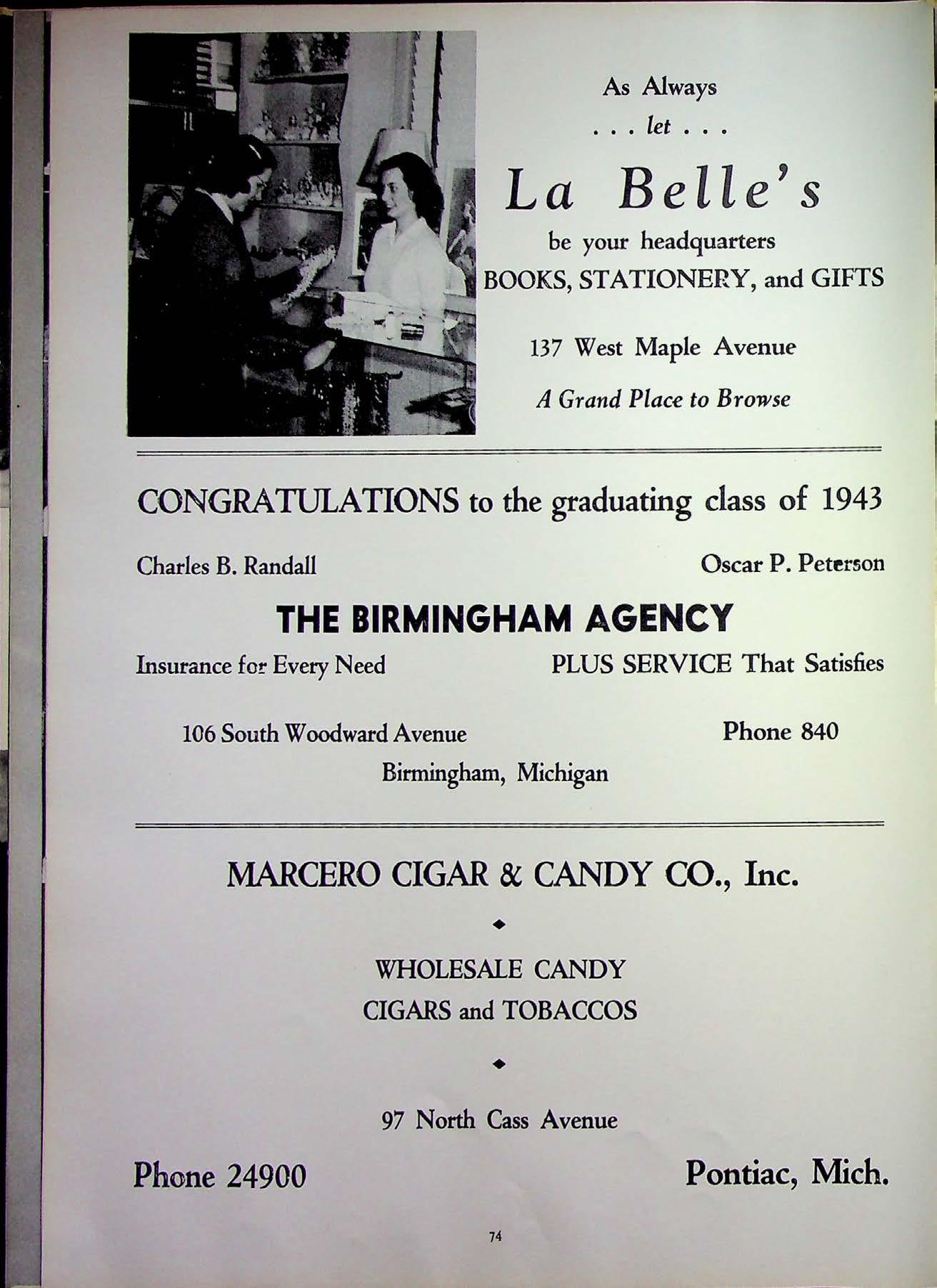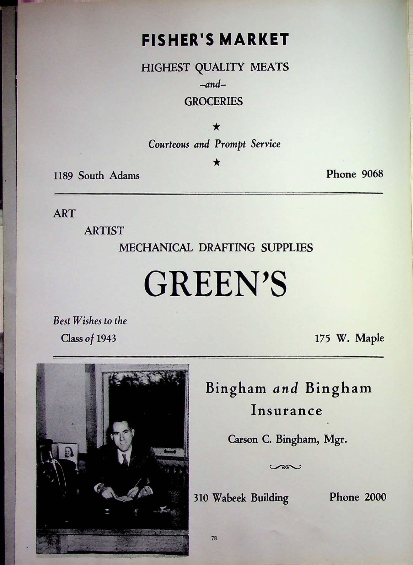 1189 South Adams ART ARTIST FISHER'S MARKET HIGHEST QUALITY MEATS -andGROCERIES * Courteous and Prompt Ser-vice * Phone 9068 MECHANICAL DRATTING SUPPLIES Best Wishes to the Class of 1943 GREEN'S 175 W. Maple Bingham and Bingham Insurance Carson C. Bingham, Mgr. 310 Wabeek Building Phone 2000 78