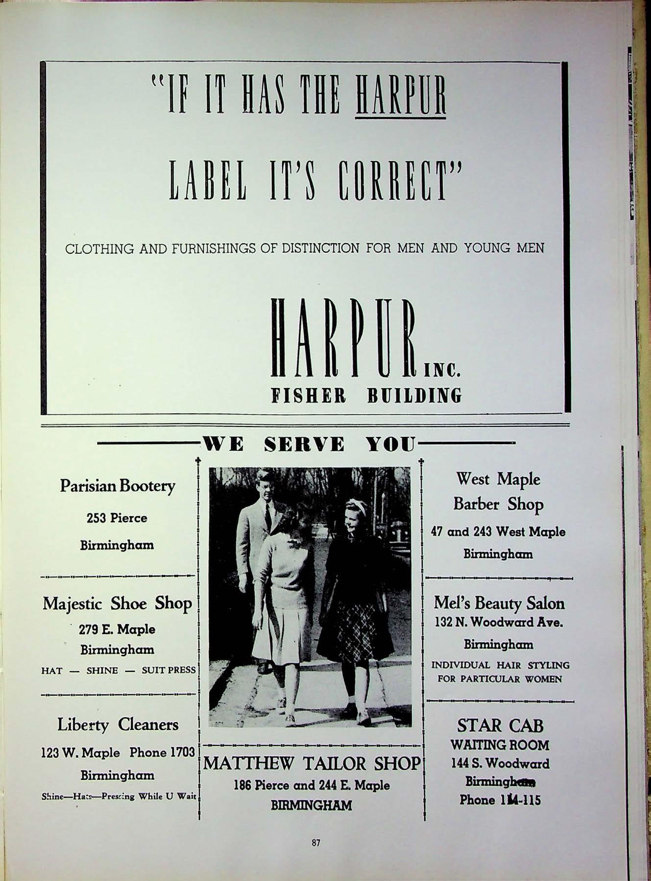 CLO THING AND FURNISHINGS OF DISTINCTION FOR MEN AND YOUNG MEN INC. FISHER B1JILDING YOU--Parisian Bootery 253 Pierce Birmingham · 279 E. Maple Birmingham HAT - SHINE - SUIT PRESS 123W.Maple Phonel703 MATIHE B W TAILOR SHOP mnmg am 186 Pierce and 244 E. Maple BIRMINGHAM S!une-Ha~Pres!.:ng While U Wait 87 West Maple Barber Shop 47 and 243 West Maple Birmingham Mel's Beauty Salon 132 N. Woodward Ave. Birmingham INDIVIDUAL HAIR STYLING FOR PARTICULAR WOMEN STAR CAB WAITINGROOM 144 S. Woodward Birmingbe Phone lM-115