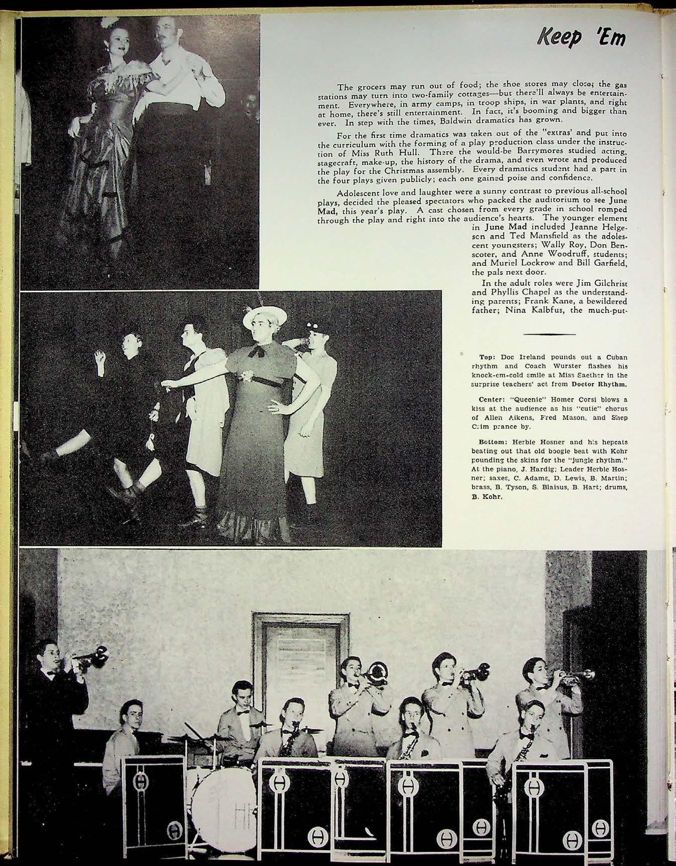 Marching side by side in the war effort with high school students all over the nation are Baldwin students All through chis book you sec chem giving service-service co their country in time of need, service 10 their community, to rheir school, and 10 each ocher.