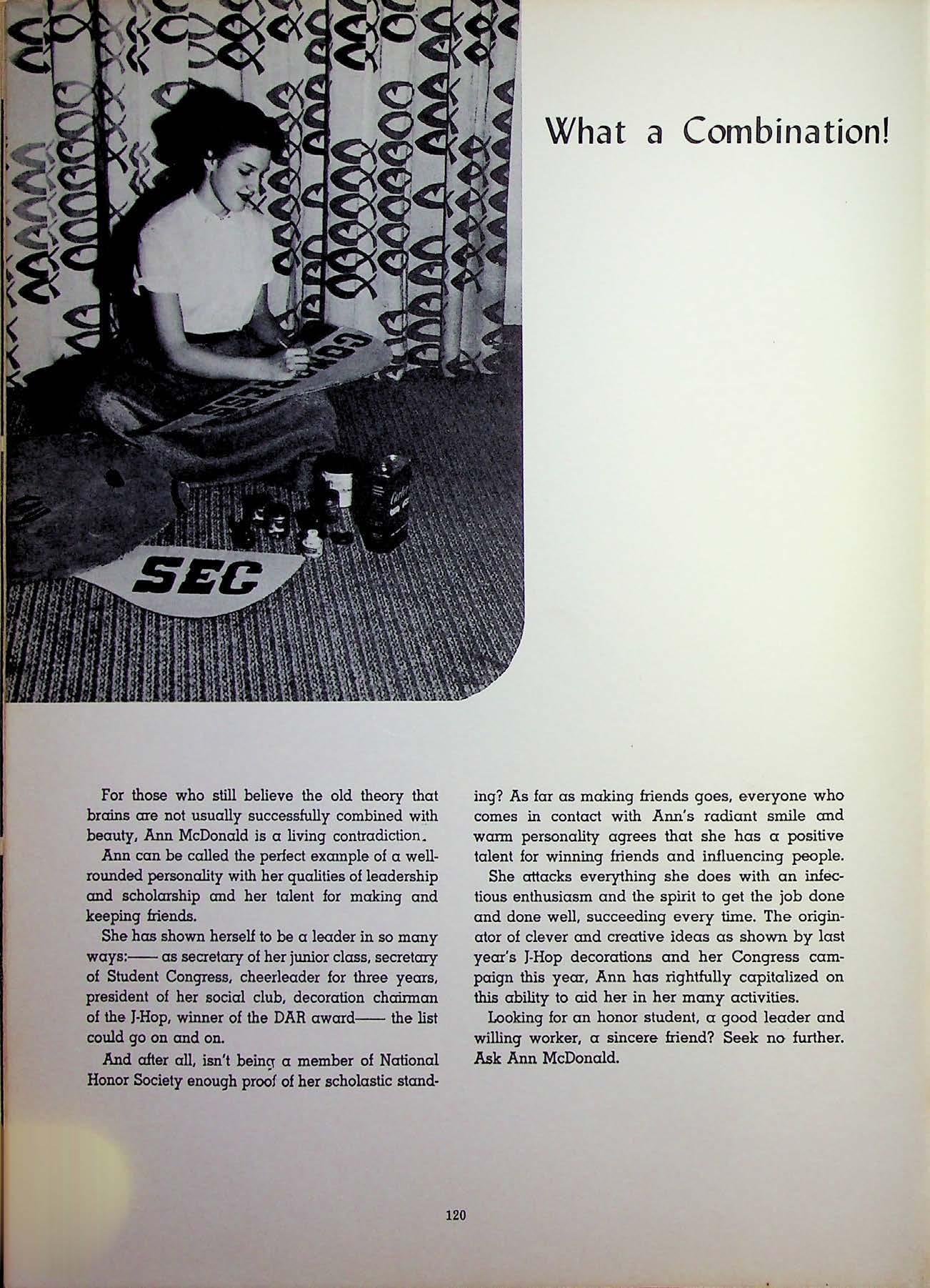 BILL MARTIN: Cong. 4: Prose. 3 , vice-pres 4; Bond 2 -4; swimm i~g mgr. 2-3; intro murols 4; Fit.tld day 3-4; KST 2•3, corr sec. 4 , CARROLL MIDDLETON: GAA 3; Fut. Nurses' ?.-3. treas 4; Span club 4; Var. show 3-4; Choir 2-4; Sapphire 2-3. corr. sec. CAROLYN McLEESE: Cong. 2; Prose. 3 -4; Span club 3; Pep club 3-4; Var. show 3-4; Def. Council 3; Garcon club 3-4; Library staff 4; Field day; Tri -A 3, rec sec. 4.