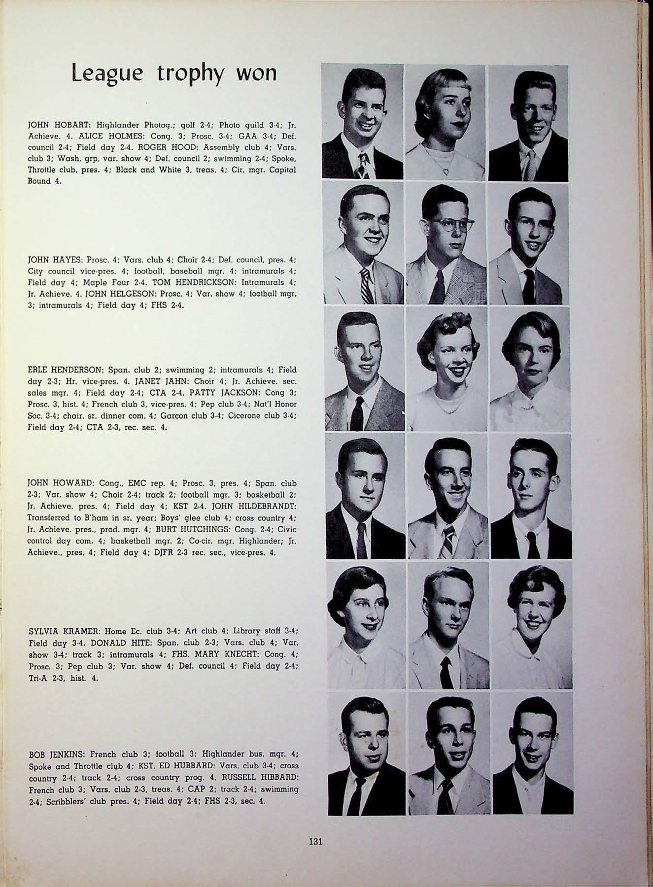 JOHN HOBART: Highlander Photog : golf 2-4; Photo guild 3-4: Jr. Achieve. 4. ALICE HOLMES: Cong. 3; Prose. 3-4: GAA 3 -4: Del. council 2 -4: Field day 2 -4. ROGER HOOD : Assembly club 4: Vars. club 3: Wash. grp. var show 4; Def. council 2; s w imming 2-4; Spoke. Throttle club. pres. 4; Black and White 3. treas. 4; Cir. mgr. Capital Bound 4.