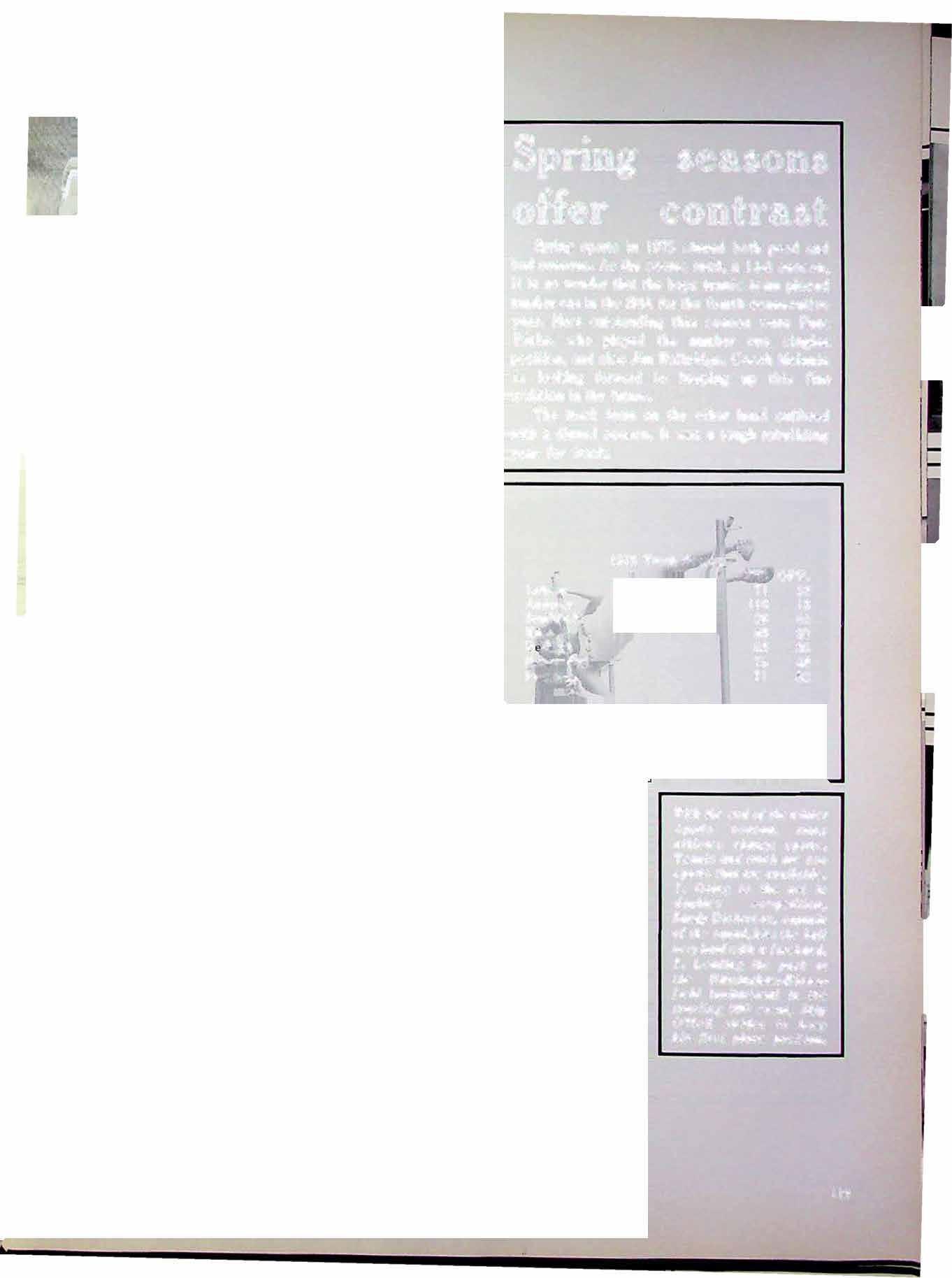 Spring sports in 1975 shared both good and bad seasons. As the scores read, a 14•3 season, it is no wonder that the boys tennis team placed number onein theSMA for the fourth consecutive year. Most outstanding this season were Pete Siske, who played the number one singles position, andalso Jim Walbridge. Coach Mclnnis is looking forward to keeping up this fine tradition in the future.