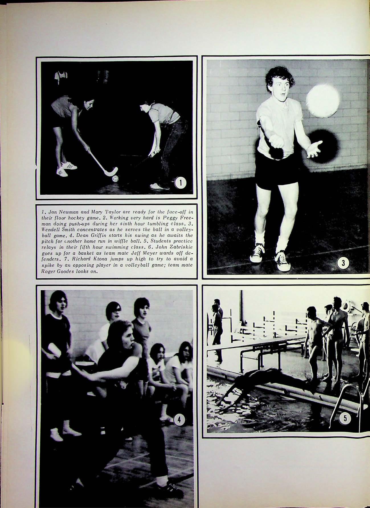 I. Starting pitcher Jim Kazanski hurls anotherstrike. 2. Senior Tom I/ague prepares to tag a runner out. 3. Playing first base againstKimball, Bruce,\lcElhinneysticks roitharunner. 4.Going (or the big hit, Greg Probst swings a mighty bat. 5. Joe George,swings (or a hit.