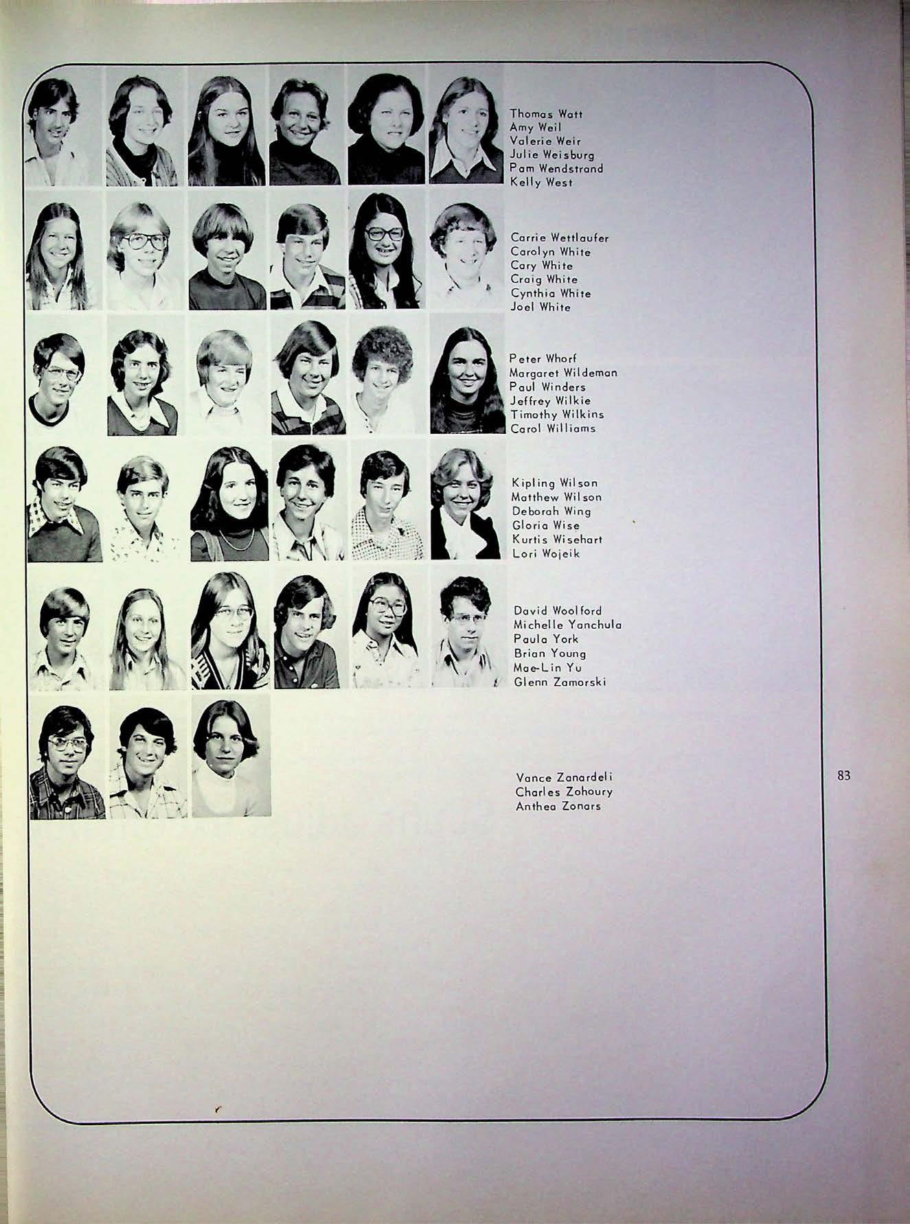 Wyckoff, Va le rie 67 zohoury Charles 83,213 Whitcomb, Rebe cca 53,242, Wilkinson, Scott 53,202, Wirpso, Margaret 53 wyoral Bob 53,243 Zohoury, mark 54 246,248,254 217,262,272,274 Wise, Gloria 83,166, 214, y Zoller, jerome 67 White, cora 53 Wi lkinson, Susan 67,214, 274 yanchula Michelle 83,84 zonars athena 67 White, cary 83 274 Wishart, Kurtis 83,215 York, paula 83 zoschnick Jon 67 White, carolyn 83 Wil lard, Heide 67 Woelk, Holly 53 Young, brian 83 Zucco, brad 54,108,252