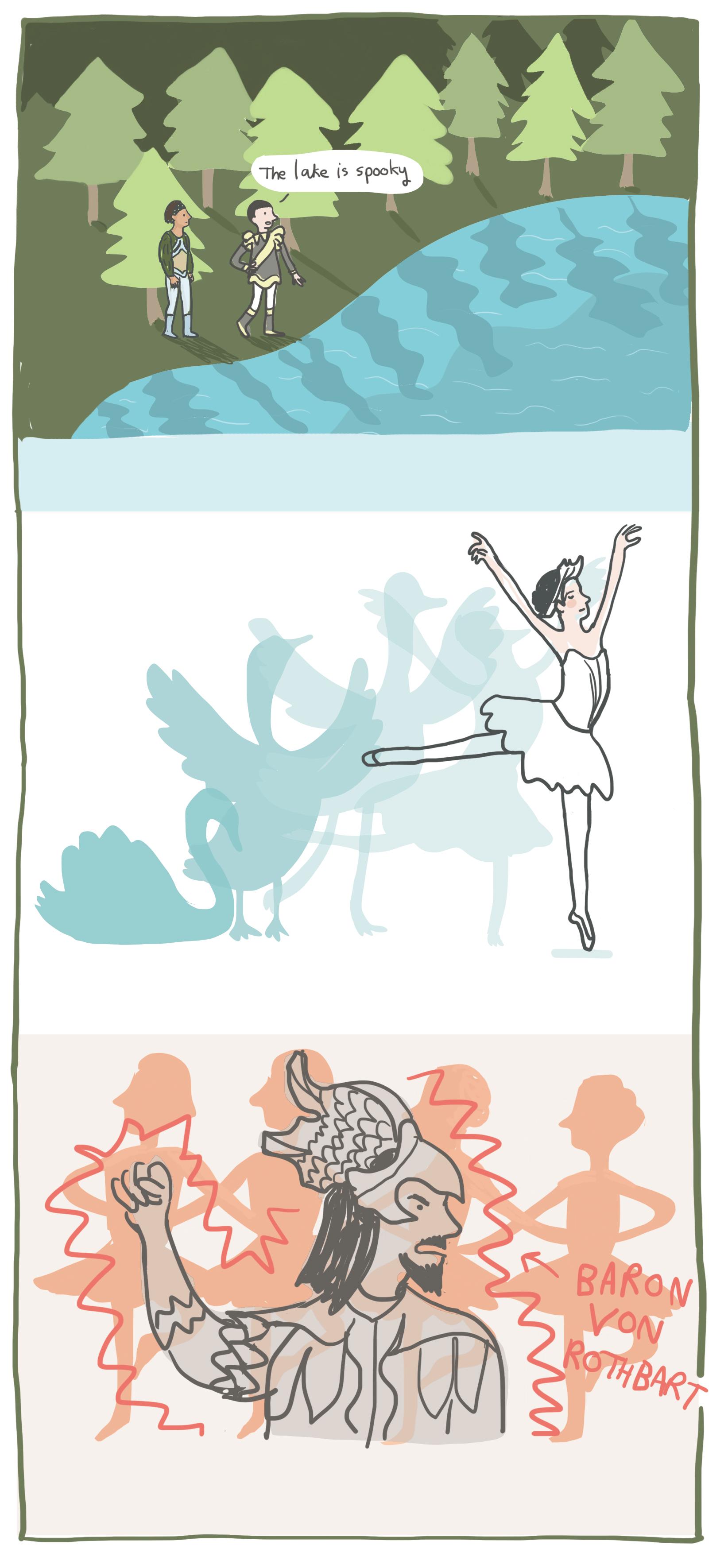 Within his typical colourful, varied and romantic orchestration, this oboe theme can be heard throughout the ballet. The scene for the introduction of this theme is set by the upper string section, using a technique called tremolando which creates a shimmering sound symbolising water and a feeling of anticipation.