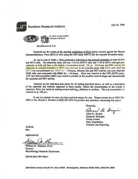 The BIRM® ECA 10-142 in vitro, reports non-cytotoxic even at the highest concentration tested, and moderate anti-HIV activity with % reduction in syncytia-formation of 59%; (Southern Research Institute, Birmingham Alabama, U.S.A.; July 1991)