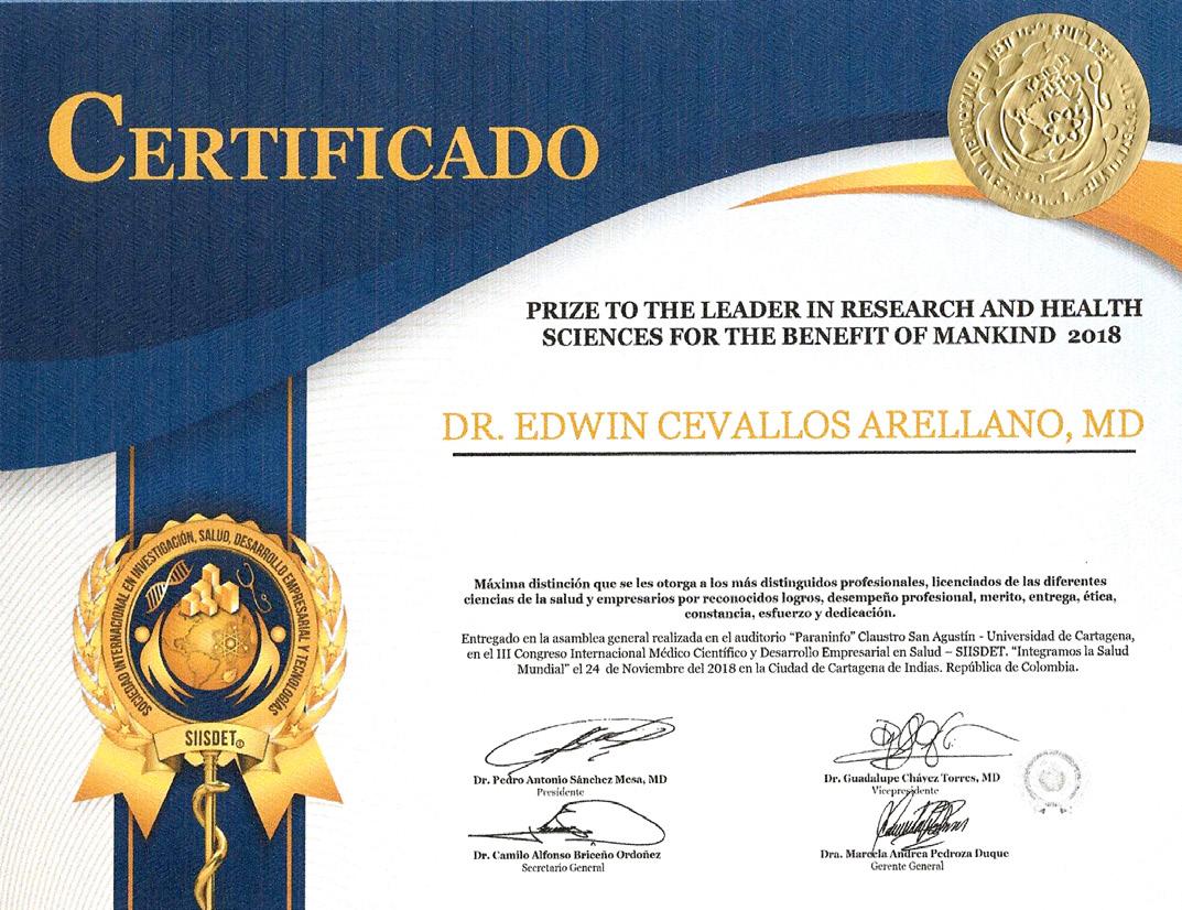 “AWARD TO THE LEADER IN RESEARCH AND HEALTH SCIENCES FOR THE BENEFIT OF MANKIND 2018” which is awarded by the Steering Committee, evaluators, national and international of the International Society for Research, Health, Business Development and Technologies, SIISDET