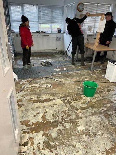 The carpets have been removed, but water has got under the sub-floor, lifting the screed base. The centre had to get contractors in with machinery to dig up the floor.