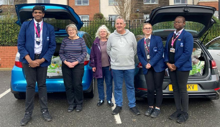 Pics: (left) bags of items collected by Cedars’ students; (top) students and volunteers from Birstall Food Bank ready to unload the bags for distribution