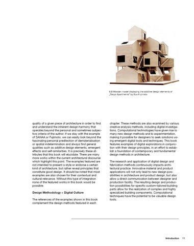 quality of a given piece of architecture in order to find and understand the inherent design harmony that operates beyond the personal and sometimes subjective criteria of the author. If we stay with the example of SANAA or Fujimoto, we can easily look beyond the fascinating personal predilection of dematerialisation or spatial indetermination and always find general qualities such as additive design elements, emergent effects and self-similarities. It is precisely these attributes that this book will elucidate. There are many more works within the current architectural discourse which highlight this point. The examples featured are not intended to present a style or endorse a certain kind of architecture, but rather reveal principles that constitute good design. It should be noted that most examples are also chosen for their contextual and cultural relevance. Without this type of integration none of the featured works in this book would be possible. Design Methodology + Digital Culture The references of the examples shown in this book complement the design methods featured in each