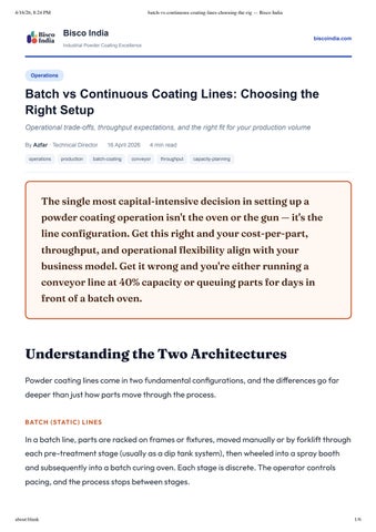 The single most capital-intensive decision in setting up a powder coating operation isn't the oven or the gun it's the line configuration. Get this right and your cost-per-part, throughput, and operational flexibility align with your business model. Get it wrong and you're either running a conveyor line at 40% capacity or queuing parts for days in front of a batch oven.