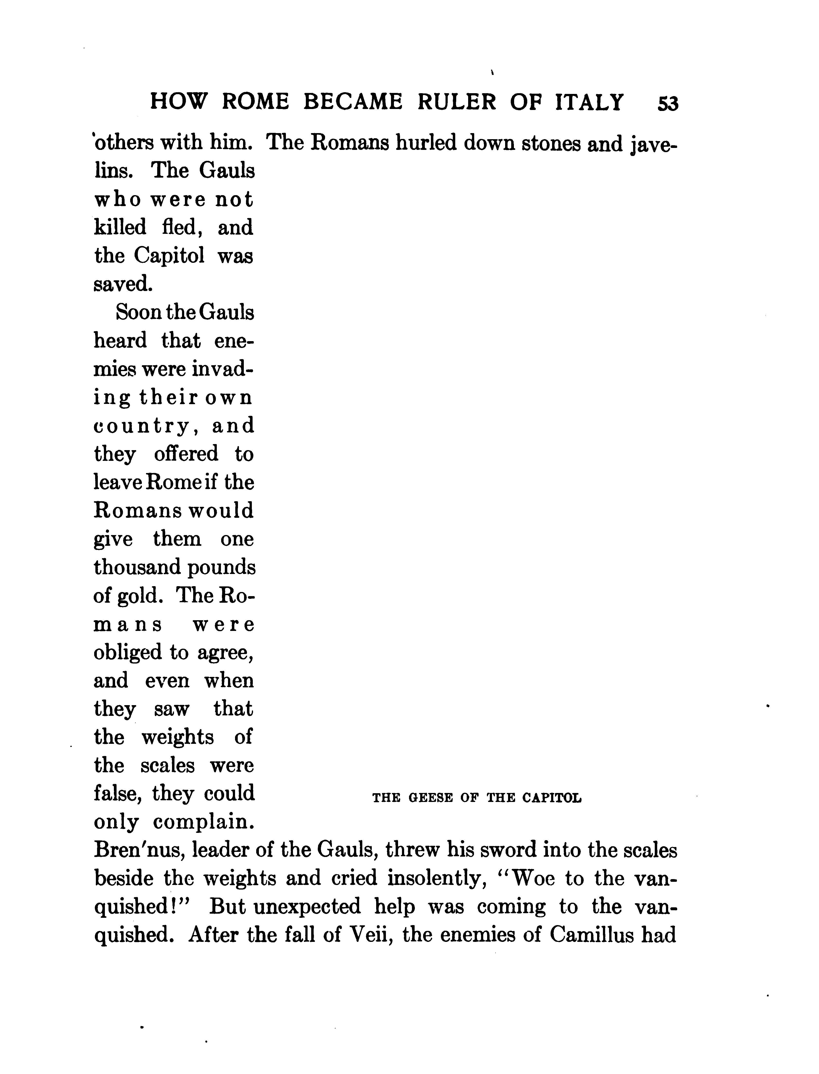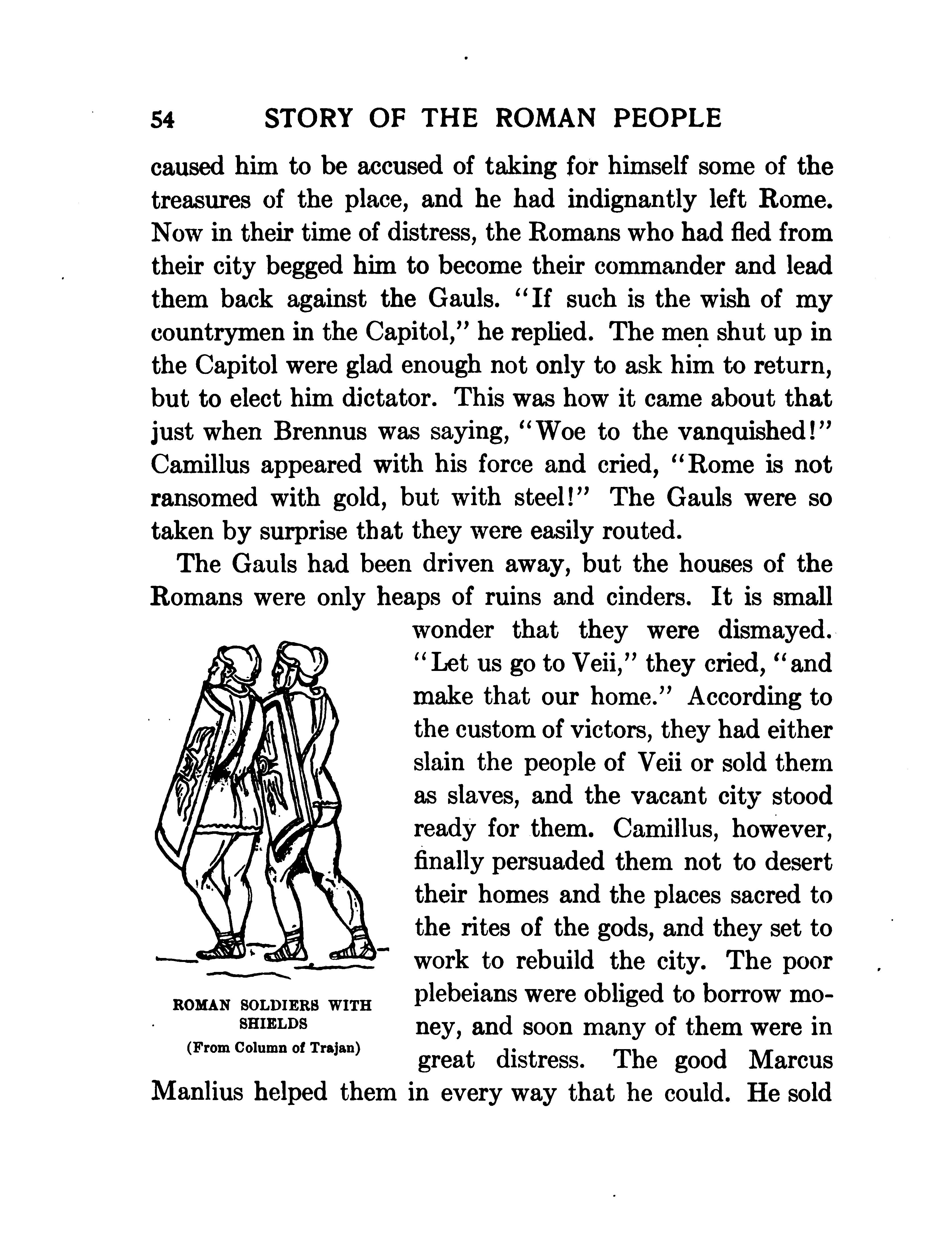 " Let us go to Veii, they cried , and make that our home. According to the custom of victors, they had either slain the people of Veii or sold them as slaves, and the vacant city stood ready for them . Camillus, however , finally persuaded them not to desert their homes and the places sacred to the rites of the gods , and they set to work to rebuild the city. The poor plebeians were obliged to borrow mo ney, and soon many of them were in great distress . The good Marcus