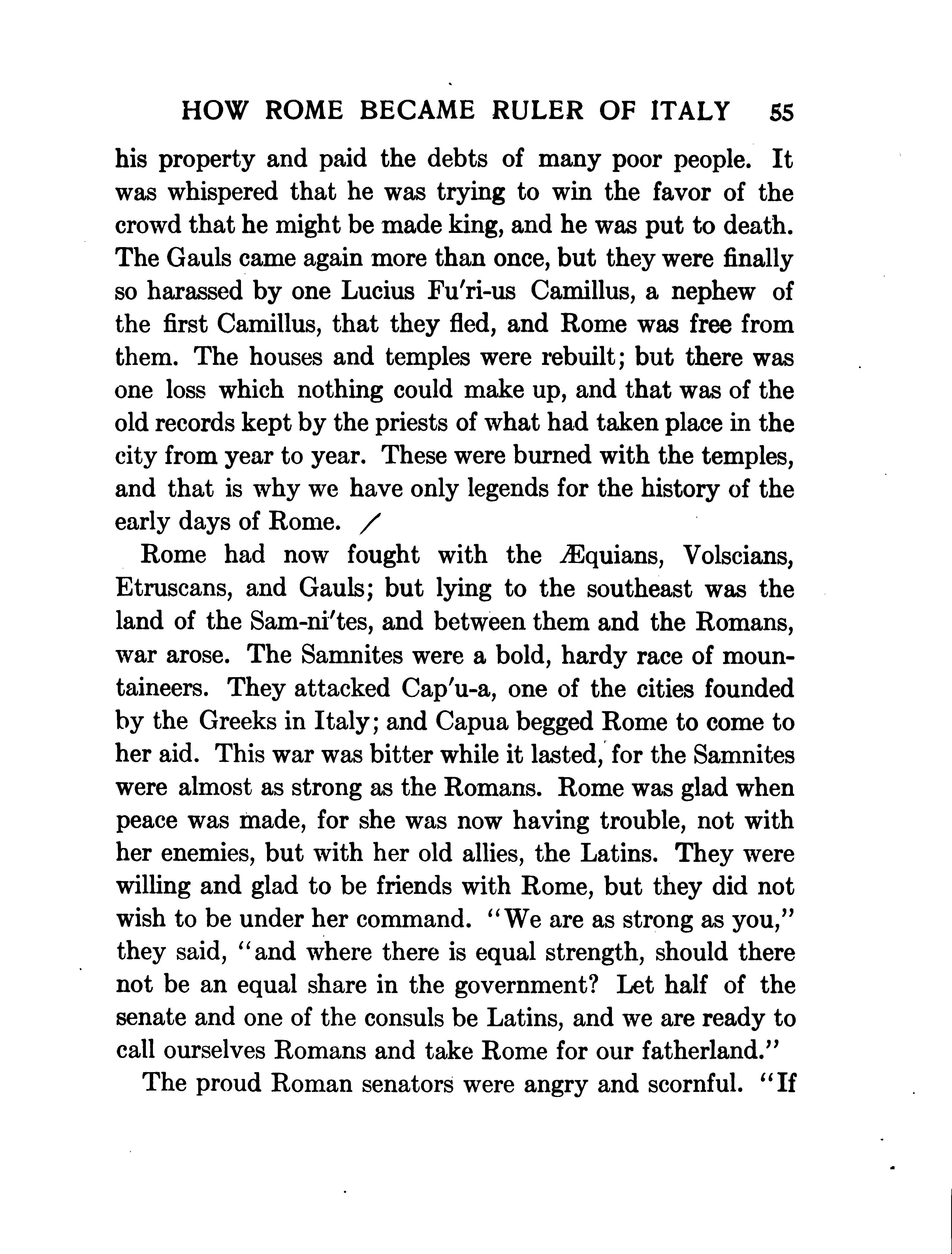 his property and paid the debts of many poor people . It was whispered that he was trying to win the favor of the crowd that he might be made king, and he was put to death . The Gauls came again more than once, but they were finally so harassed by one Lucius Fu'ri-us Camillus, a nephew of the first Camillus , that they fled , and Rome was free from them . The houses and temples were rebuilt; but there was one loss which nothing could make up, and that was of the old records kept by the priests of what had taken place in the city from year to year. These were burned with the temples, and that is why we have only legends for the history of the early days of Rome . / Rome had now fought with the Æquians , Volscians, Etruscans , and Gauls ; but lying to the southeast was the land of the Sam-ni'tes , and between them and the Romans , war arose . The Samnites were a bold , hardy race of moun taineers . They attacked Cap'u-a , one of the cities founded by the Greeks in Italy ; and Capua begged Rome to come to her aid . This war was bitter while it lasted , for the Samnites were almost as strong as the Romans . Rome was glad when peace was made , for she was now having trouble, not with her enemies, but with her old allies , the Latins. They were willing and glad to be friends with Rome , but they did not wish to be under her command . We are as strong as you , they said , and where there is equal strength , should there not be an equal share in the government ? Let half of the senate and one of the consuls be Latins , and we are ready to call ourselves Romans and take Rome for our fatherland ."