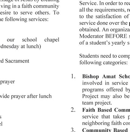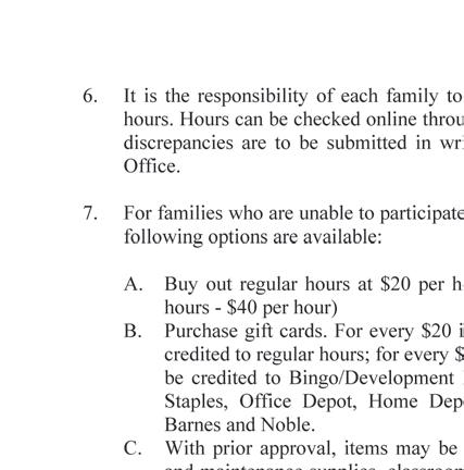 1. Each family must render 36 hours of service to the school. Families that receive financial aid are required to complete an extra 6 hours of service through the Bingo Program. Parent hours must be completed in the following categories: 20 – various 6 - Bingo (setup, take-down, game worker) 10 - Development (arranged through the Development Office, ext. 7401)