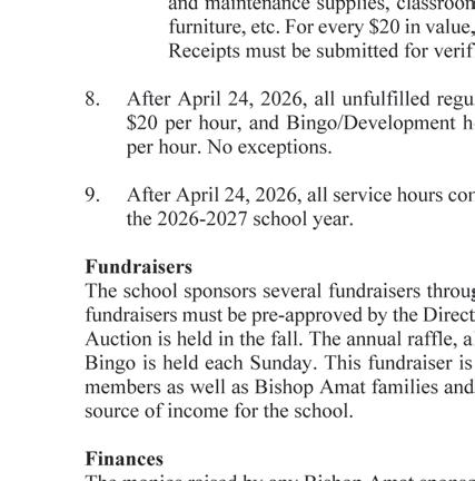 Every family is also obligated to render 36 hours of volunteer service during the 2025-2026 school year (April 16, 2025 - April 30, 2026). Of these 36 hours, 6 hours must be served through the Bingo Program and 10 hours must be served through the Development Office