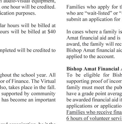 To contribute to the Parent Pledge Program, parents may visit the website at bishopamat.org, Giving and can opt to make a one-time payment of $420 by July 31 and earn 5 Development hours, or pay monthly.