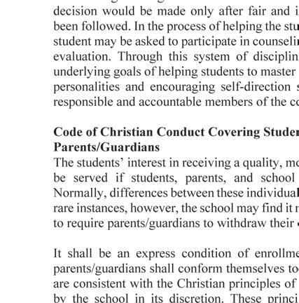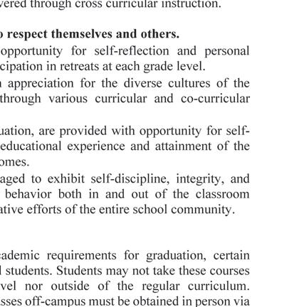 The importance of Discipline and a disciplined lifestyle follows from the call to Goodness. The underlying purpose of the disciplinary code is to help students master the internal forces of their personalities so as to enable them to submit themselves to the Lordship of Jesus Christ. Thus obedient, they will be responsible and accountable members of the human family. School regulations such as the distinct dress and grooming regulations are part of the call to self-respect, self-discipline, and personal responsibility. The aim of Discipline is not conformity but authentic freedom to be all that God has created us to be.