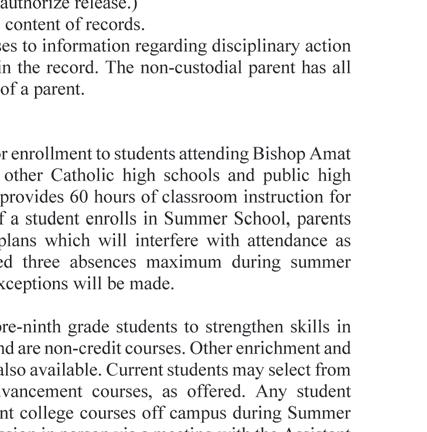 Bishop Amat High School may accept college courses for credit in order to make up a failing grade, but only when the make-up class is not available at Bishop Amat during the summer.