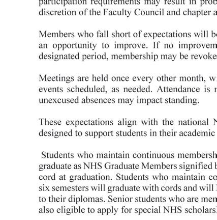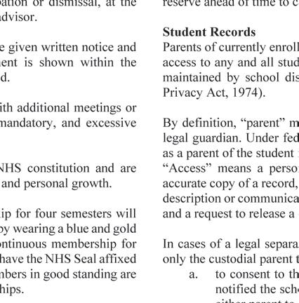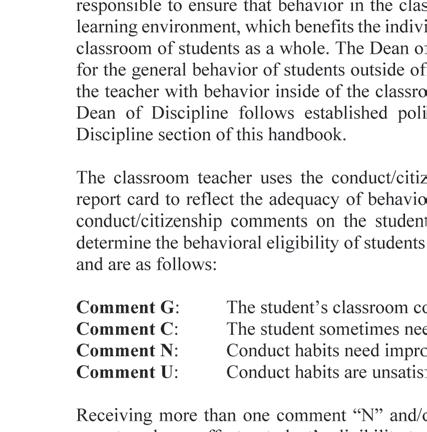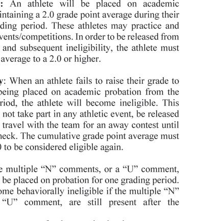 3. Students who are elected into office must maintain their satisfactory attendance and discipline status in order to stay in office. An Officer who commits a violation, which is liable to probation or withdrawal, according to the Disciplinary Actions listed in this handbook, may be required to relinquish the office. Officers who receive multiple “N” comments, or a “U” comment, on their report card, will be put on probation until the next grading period. Officers will be declared behaviorally ineligible to hold office if multiple “N” comments, or a “U” comment, is still present after the probationary period.