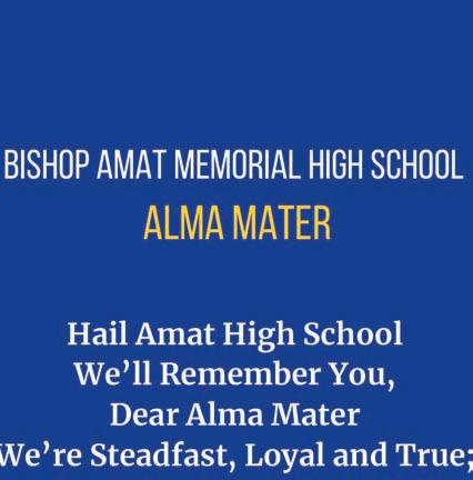 Bishop Amat Memorial High School is a four-year co-educational Archdiocesan Catholic high school. The mission of the school is to form a faith-filled community and to provide a quality education that addresses the needs of a culturally and academically diverse student body. The comprehensive instructional program flows from a college preparatory curriculum that empowers students to recognize their potential and to meet educational and life challenges in the future. The school, working in partnership with parents and the community, promotes education in Goodness, Discipline and Knowledge by preparing students to embrace Gospel values, to respect themselves and others, to become life-long learners, and to contribute positively to the community.