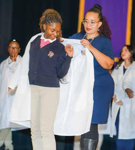 Team Loughlin is not playing timidly. We have strong partnerships. You have seen some, like the Arthur Ashe Program at Downstate, where we continue to have the largest number of accepted participating students. These students graduate from the program with high honors. We also have newer partnerships, like the one forming with Northwell Forest Hills Hospital. Both experiences enrich students' understanding of the many opportunities in the medical professions. And of course, the White Coat Ceremony for students completing three years of courses in our Biomedical Program provides welldeserved recognition and pride for students and their families.