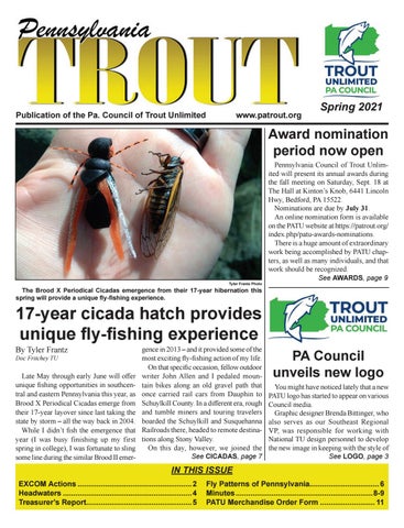 gence in 2013 – and it provided some of the most exciting fly-fishing action of my life. On that specific occasion, fellow outdoor writer John Allen and I pedaled mountain bikes along an old gravel path that once carried rail cars from Dauphin to Schuylkill County. In a different era, rough and tumble miners and touring travelers boarded the Schuylkill and Susquehanna Railroads there, headed to remote destinations along Stony Valley. On this day, however, we joined the See CICADAS, page 7