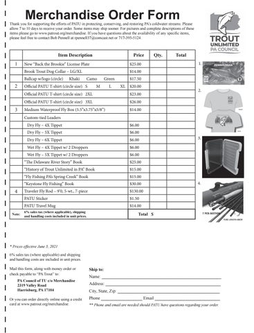 * Prices effective June 5, 2021 6% sales tax (where applicable) and shipping and handling costs are included in unit prices. Mail this form, along with money order or check payable to “PA Trout” to: PA Council of TU c/o Merchandise 2319 Valley Road Harrisburg, PA 17104 Or you can order directly online using a credit card at www.patrout.org/merchandise.