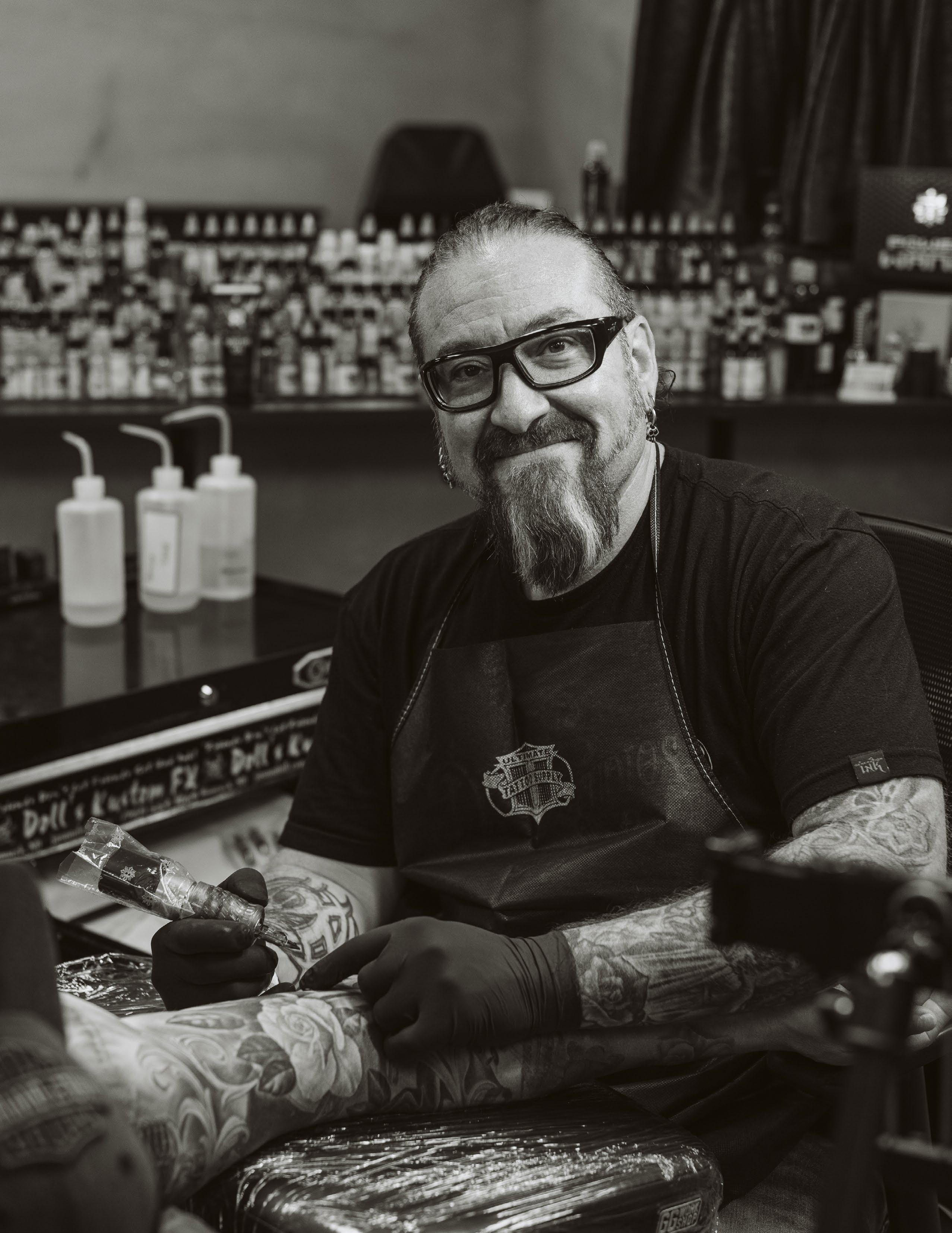 he says. “Every tattoo has a story.” He keeps the atmosphere in his shop relaxed so his clients feel comfortable, displaying different horror memorabilia that he’s collected over the years.