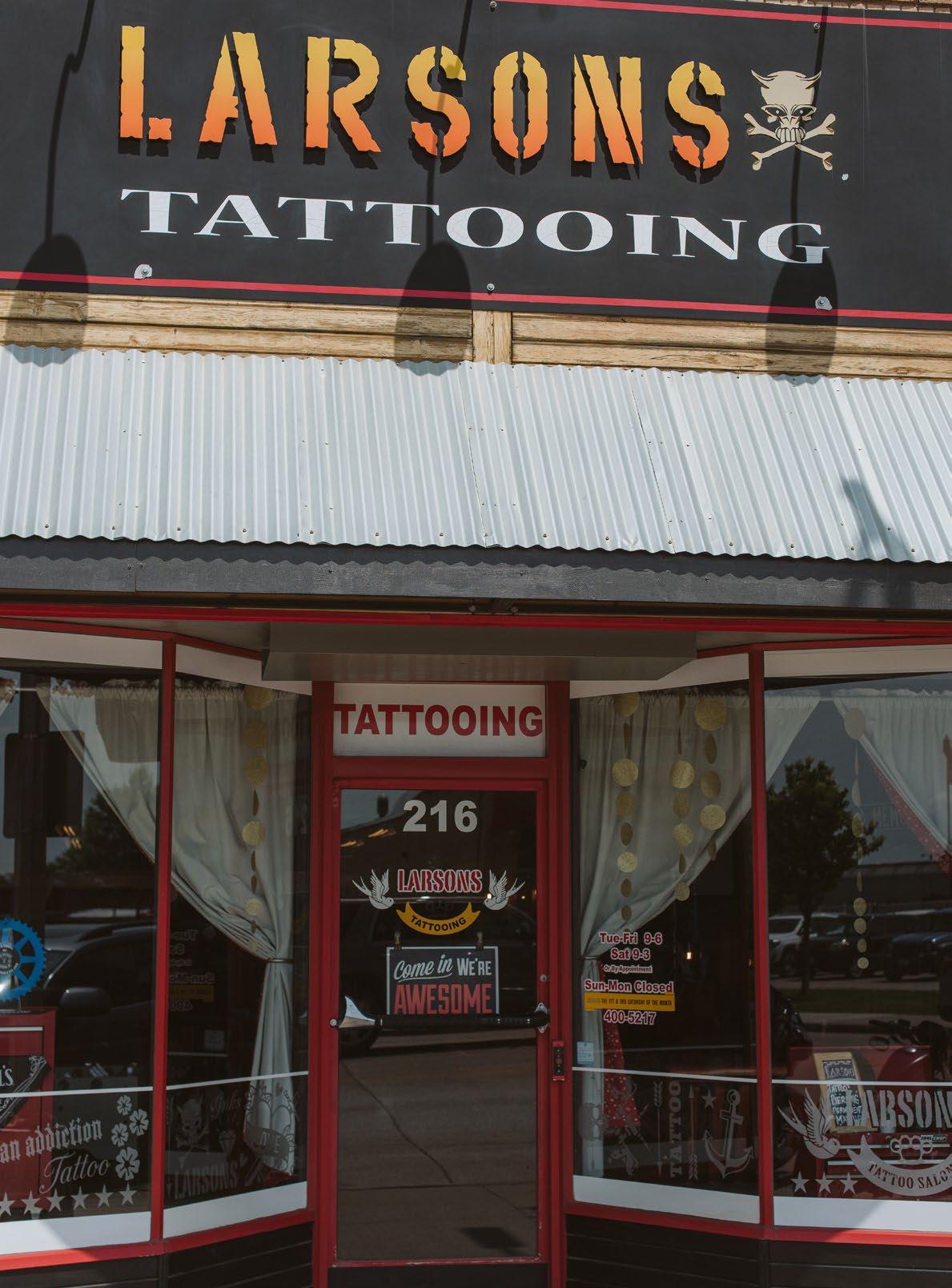 from kids getting their ears pierced to someone looking for small lettering to tattoo collectors working on a full sleeve,” Amber describes. Their small but talented team can assist with tattoos, piercings or even permanent makeup. “We try to make our business family-friendly and welcoming,” says Amber. “Plus we have team members who have been working in this industry for a long time.” For the Larsons, the best part of their work is the relationships built along the way. “[We enjoy] connecting with the customers and hearing their stories,” says Amber. “We’re fortunate people choose to trust us.”