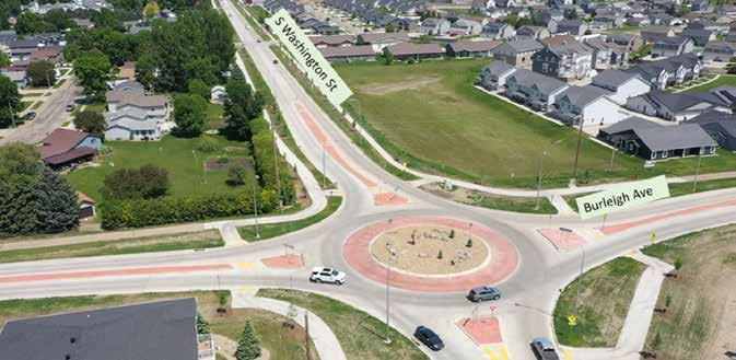 Completed in 2024, the South Washington Street and Burleigh Avenue roundabout improves traffic flow and walking access as south Bismarck continues to grow.