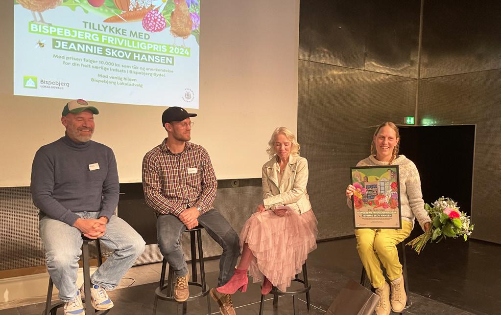 I november uddelte Bispebjerg Lokaludvalg priser på den årlige netværks- og puljeaften. Årets Frivilligpris gik til Jeannie Lesmer, der i 15 år har været frivillig i Københavns Skolehaver. Jeannie har gjort en stor indsats for at oplære andre frivillige og organisere aktiviteter til at møde børn og familier med et smil – en indsats, der blev modtaget med stor applaus.