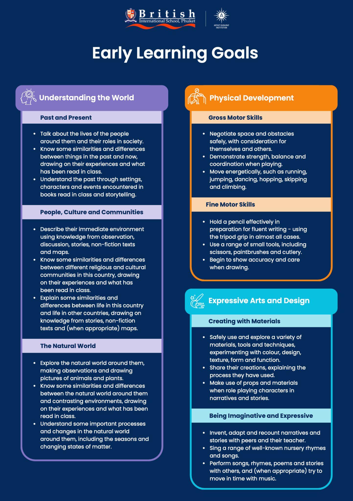 The Early Years learning experience here at BISP is based on the EYFS 2021 framework and is supported by the non-statutory guidance of ‘Birth to 5 Matters’. It includes: