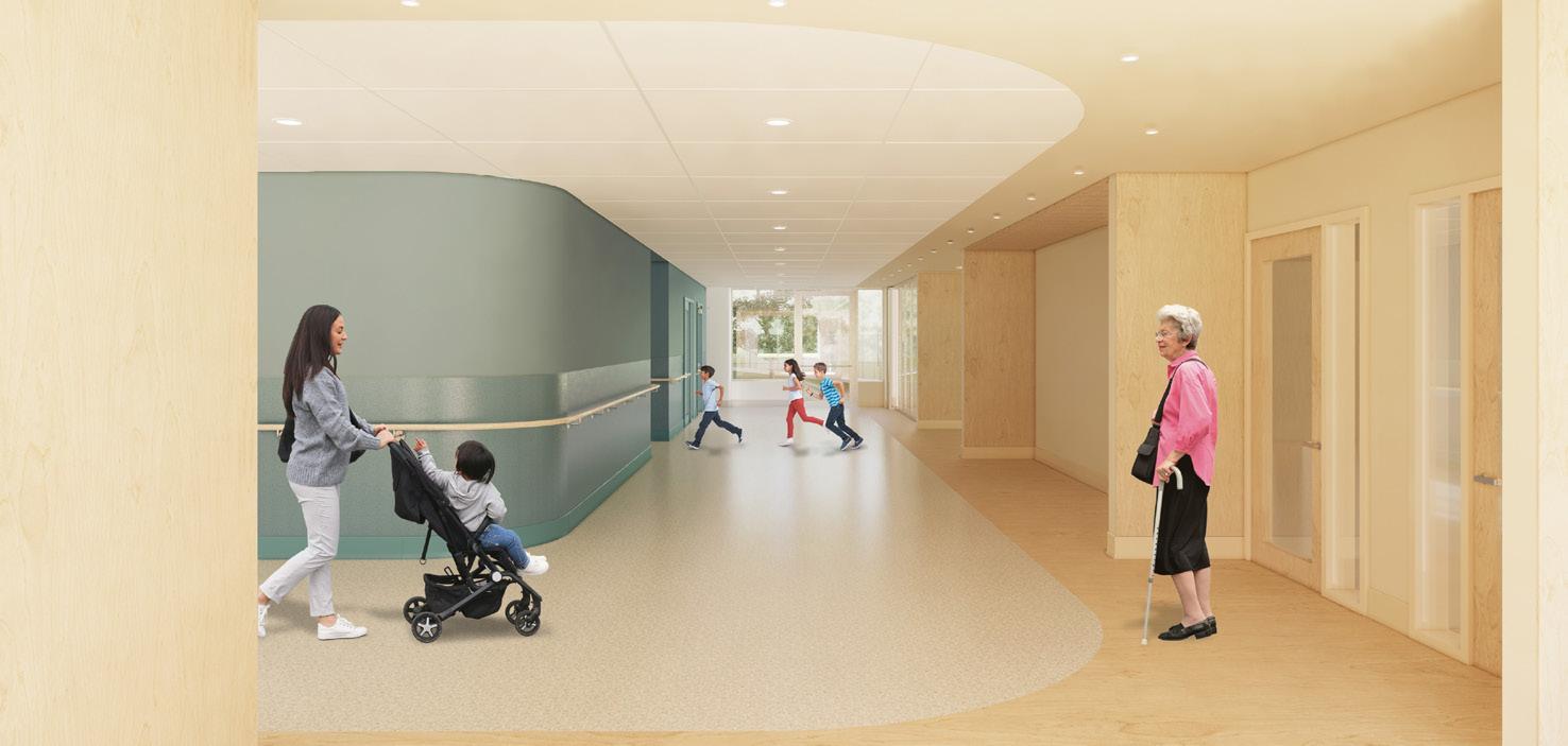 Situé au premier étage du bâtiment, un centre de la petite enfance (CPE) accueillera aussi des enfants, incarnant parfaitement les principes fondamentaux des maisons des aînés, centrés sur l’intergénération. Cette cohabitation entre générations encourage des interactions enrichissantes et contribue à un milieu de vie stimulant.