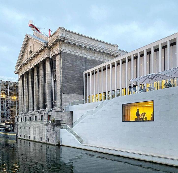 James-Simon-Galerie de 2019, un edificio museístico con columnas blancas situado en la Isla de los Museos de Berlín y declarado Patrimonio de la Humanidad por la UNESCO.