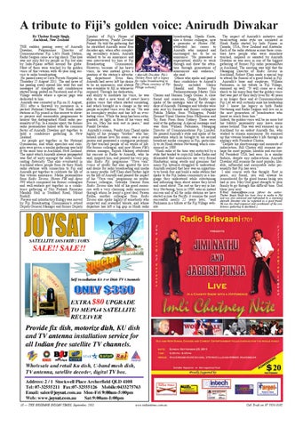 Speaker of Fiji’s House of broadcasting. Shashi Kanta, Representatives, Pundit Devakar also a former colleague, now Prasad. He told the gathering that a presenter at Humm FM, he identified Anirudh some four attributed her career to decades ago, when after completAnirudh who inspired and ing secondary school, Anirudh encouraged her to be an wished to be an announcer and announcer. “He possessed a was interviewed by him at Fiji supernatural ability to work Broadcasting Commission. through and draw the attenHowever, because of his heavy tion through generations of voice, he was instead given a announcers and audience,” position at the station’s advertis- • Anirudh Diwakar, Fiji’s she said. ing department. Even then, Golden Voice left a legacy Others who spoke and passed Anirudh had never left his desire for radio broadcasting in their condolence to Anirud’s to be an announcer, and always Fiji [Photo courtesy of Fiji family included Shalen was available to fill in whenever Village website]. Shandil and former Fiji required. Through his dedication, Parliamentarians Master Shiu and ability to modulate his voice, he was Charan and Harnam Singh Golian. A close able to start a new trend of sweet heavy friend and musician, Durga Reddy also golden voice that others started emulating, spoke of the nostalgic tales of the younger and which brought in a change in the way days of Anirudh. Messages and tributes were people accepted voice over the air. “He was also sent by friends and former colleagues an exemplary worker and has left an ever- Prabha Mishra from Wellington, Pundit lasting voice. While the lamp has been extin- Hemant Vimal Sharma from Melbourne and guished, its light, in form of his voice will Tej Ram Prem from Sydney. These were live on. May his soul rest in peace,” said read at the gathering. A special message read Pundit Devakar. was from William Parkinson, Managing Anirudh’s cousin, Pundit Ami Chand spoke Director of Communications Fiji Limited. highly of his younger “brother” who har- He praised Anirudh’s style and spoke of the boured intense love for music, was a jovial innovation which he brought to his second person and possessed a contagious personal- broadcast media company in Fiji, particularity that touched people of all works of life. ly to its Hindi station Navtarang which comHis former colleague, and now Humm FM’s menced in 1989. station manager, Rajesh Maharaj attributed “Hindi radio at the time was restricted by a his success in Radio to Anirudh, who he style that tended to copy All India Radio and said, inspired him, and praised his very pop- demanded that announcers use very formal ular Radio Fiji programme “Yuva vani” Hindustani using words and grammar that (voice of youth) that also ignited the love many Fiji listeners struggled to understand. and desire for radio broadcasting and media Anirudh realized that here was an opportuniin many youths. Jeff Khan shed further light ty to break free and build a radio station that on the life of Anirudh and praised the impact spoke to the Fiji Indian community in a lanof his “Yuva vani” programme on youths. guage they understood while entertaining Former colleague, Satendra Sharma from and informing them about issues they loved Radio Tarana also told of his good memo- and cared about. The rest as they say is hisries with a very charming radio announcer tory. Navtarang, born in 1989, was an instant through whom he learnt a great deal. Pawan success and of all the radio stations we have Rekha, another colleague from Radio started across the Pacific it remains the most Tarana also spoke highly of somebody who successful nearly 22 years later, “said respected and rewarded talents, and whose Parkinson in a tribute at the Fiji Village webdeparture has left a big gap in Hindi radio site.