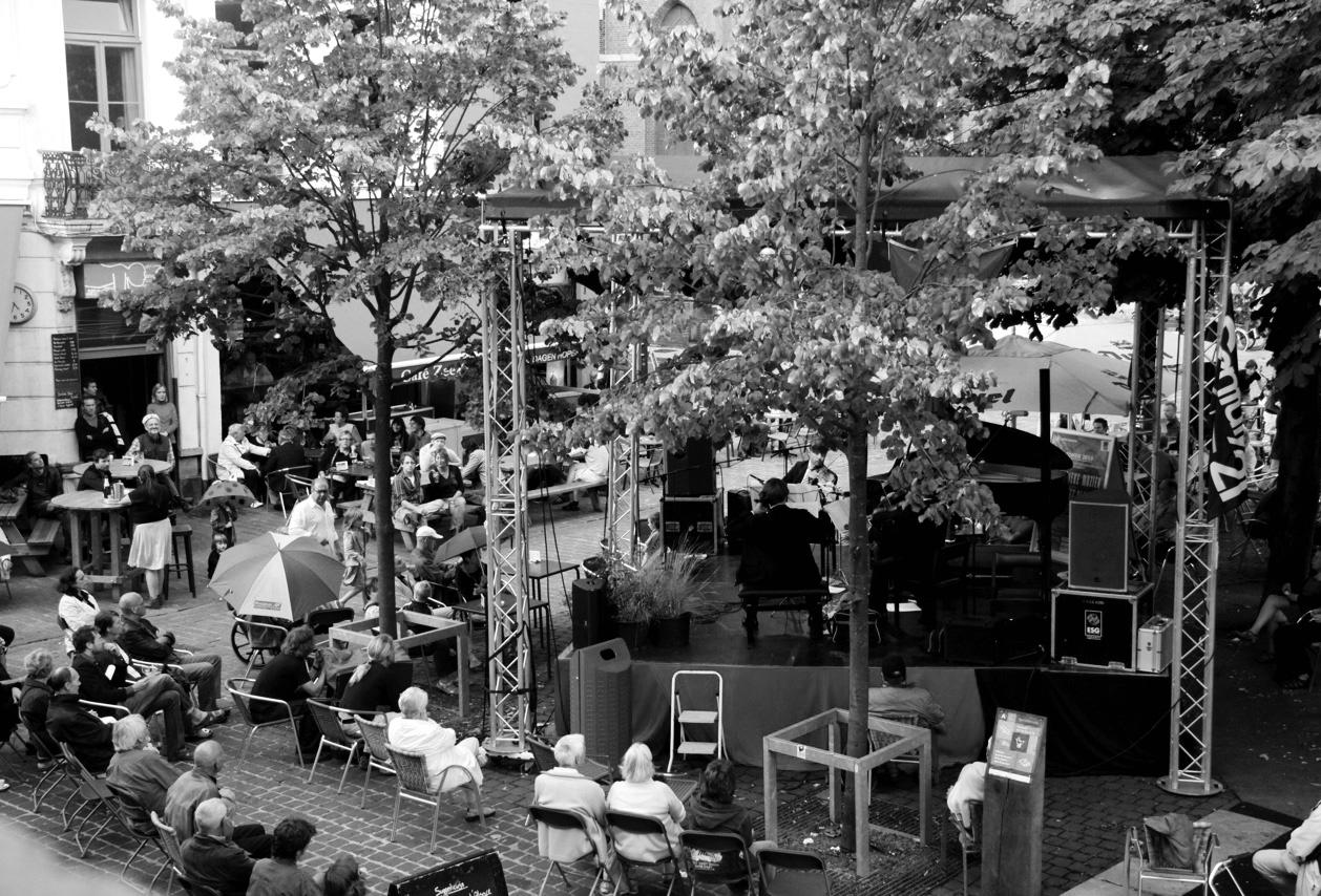 Maar er zijn ook tekenen die er op wijzen dat het ook goed gaat zonder lawaai. Klassiek op het Plein is daar een echt mooi voorbeeld van. Toch nog even zeggen waar dit idee vandaan komt. De Marokkaanse pleinwerker Musty en een paar andere pleinbezoekers speelden al geruime tijd met de idee om iets kleinschaligs op te zetten. Een beetje nostalgie naar de Dageraadfeesten speelde mee, de liefde voor muziek in het algemeen was een gegeven en een tegengewicht tegen het podiumgeweld dat we nu al een paar jaren moeten ondergaan. Arabische muziek was een optie, joodse muziek ook, een mix van de twee was een andere optie en gewoon klassieke muziek met uitsluitend mensen uit de wijk was een andere vaak gehoorde formule. Gaandeweg gingen meer en meer mensen achter deze idee staan en tenslotte werd alleen klassieke muziek weerhouden. Geen softrock, geen jazz, geen wereldmuziek, geen kindermuziek, neen, klassiek. Er werd geld bij de overheid en de horeca gevonden, een podium, mensen die het geheel wilden dragen door ondermeer affiches te maken en met een minimum aan publiciteit en ruchtbaarheid ging het geheel van start. Twee maanden lang, telkens op zondag. De eerste maand juli worstelden we met een warmtegolf en de toeschouwers druppelden langzaam naar het plein. Niet goed wetend wat ze konden verwachten. Niet alleen wat ze konden verwachten maar ook wie ze konden verwachten. En zoals voorspeld kon worden daagden er vogels van diverse pluimage op. Zangers en zangeressen, mensen die de meest waanzinnige instrumenten kwamen demonstreren. Vergeten glories die nog één keer hun moment de gloire beleefden al was het dan voor amper vijftig toeschouwers. Veelal oudere bewoners van de wijk of familie van de artiesten. Je zag het zo, op hun zondags, maar gebeiteld gedurende de duur van de optredens. Hier zaten mensen die de laatste jaren niet meer uit hun huis waren geweest, hier zag je terug kleine groepjes joodse mensen die genoten van de klassieke klanken en meer nog, op het podium stonden joodse uitvoerders. Eentje zelfs helemaal fraai uitgedost in zwart pak en keppeltje. Hij legde ondermeer Chopin op de mat en daar werden zelfs de