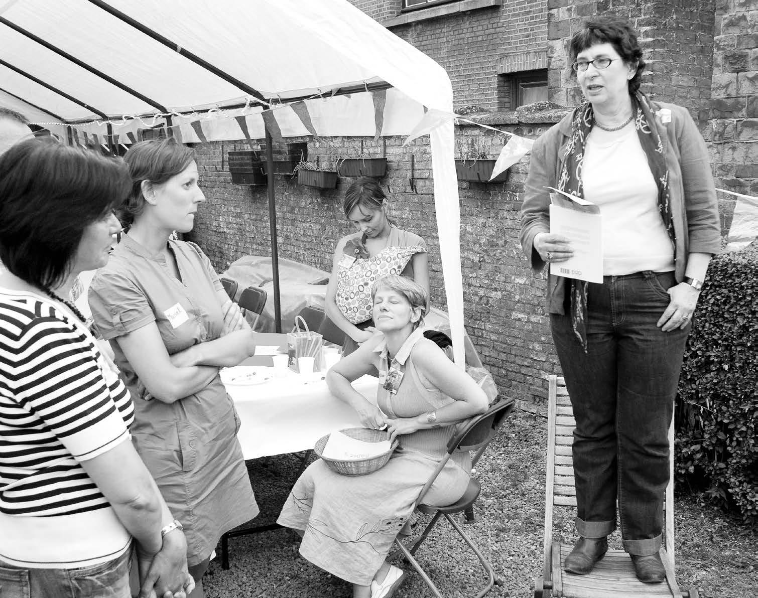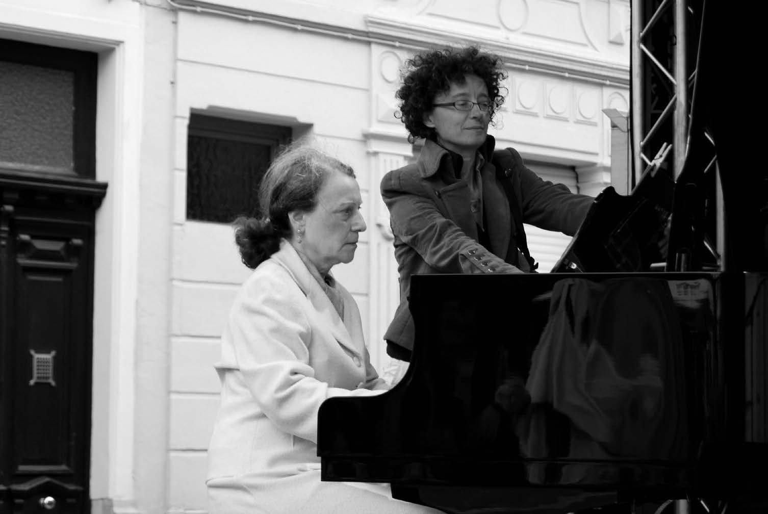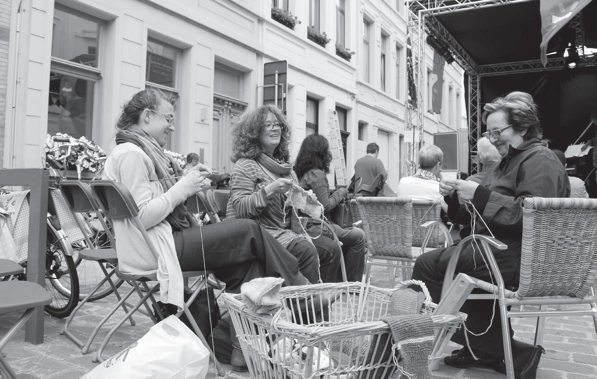 Dit kransje breiende vrouwen (waar zijn de mannen?) wil de gebruikte piano van Klassiek op het Plein een warme huid bezorgen • Foto Jeannine FUHRING