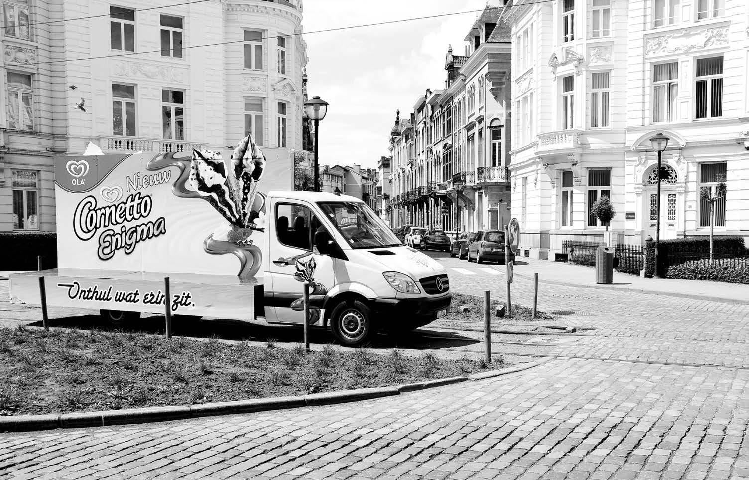Het rond punt in de Cogels- Osylei. Een verschrikking weet iedereen die daar geregeld moet zijn en een valstrik voor al diegenen die er slechts sporadisch komen. Zoals deze ijsjeskar die gewoon de tramsporen blijft volgen. Foto luc Pandelaers.