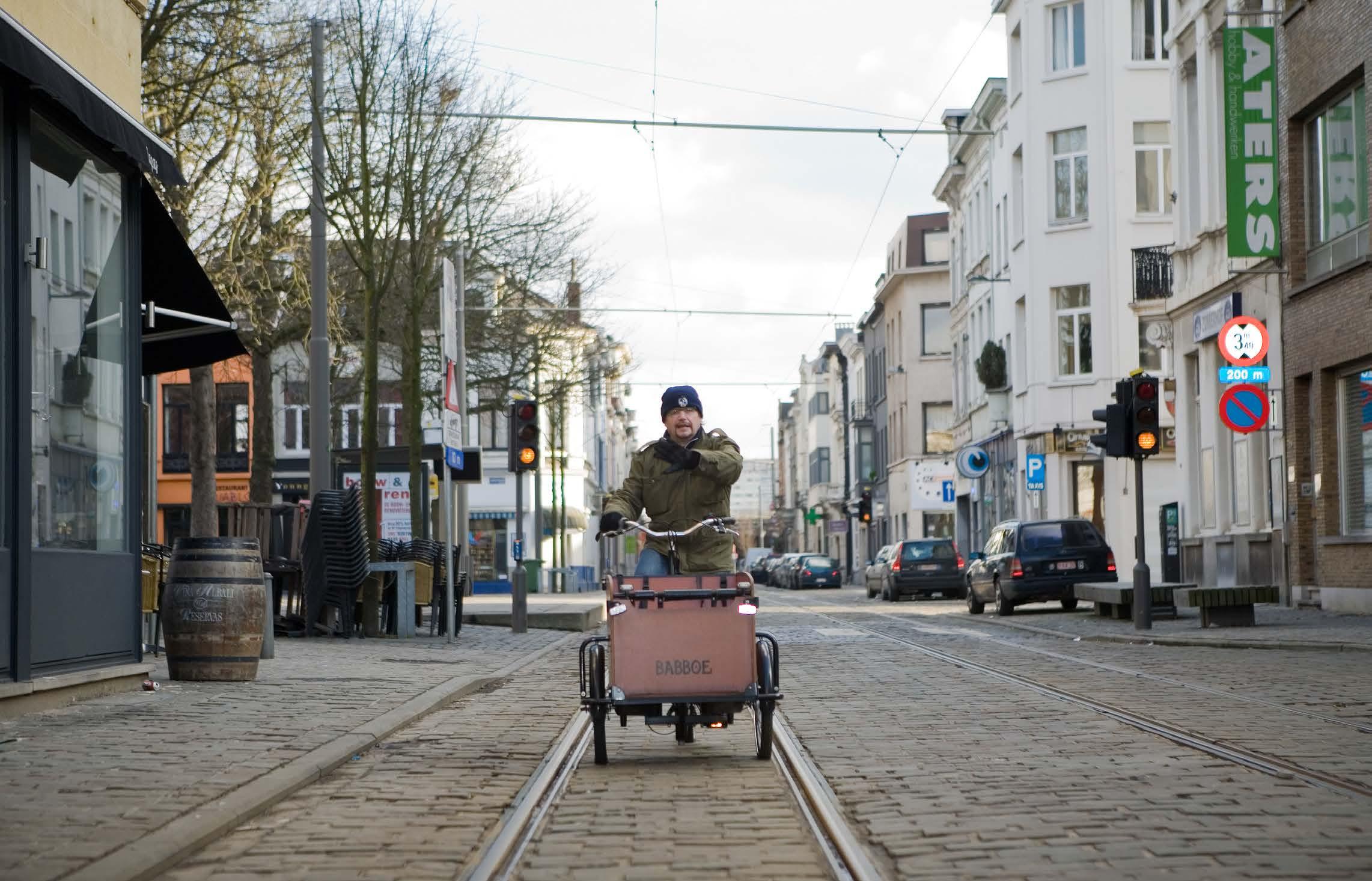 Voor de gelegenheid lieten we Nigel Williams een rondje rijden op een bakfiets door Zurenborg • Foto: Sam VAN ONGEVAL.