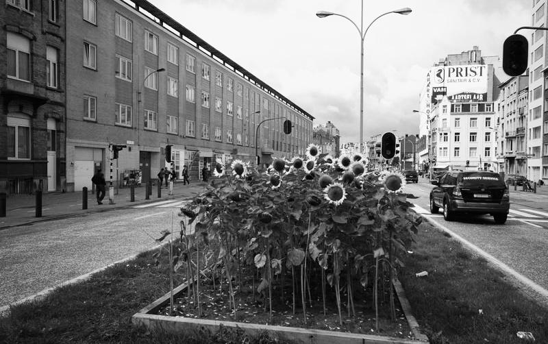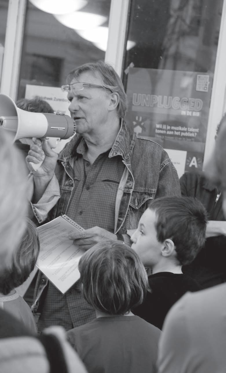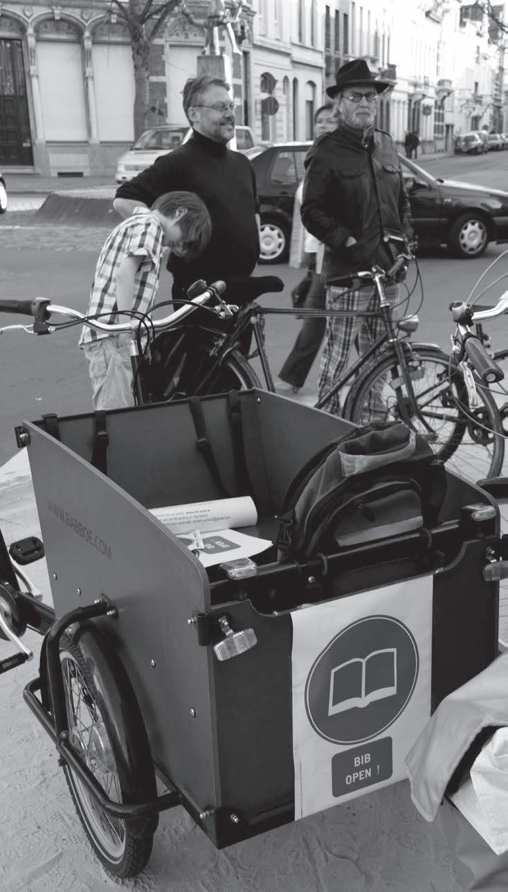 Woensdag 23 maart en de zon schijnt volop. Op de terrassen van de Dageraadplaats is er geen stoel meer vrij. In het midden van het plein verzamelen zich langzaam maar zeker een aantal mensen die in stoet willen opstappen naar de wijkbibliotheek. Opmerkelijke verschijning: Nigel Williams, de stand-upcomedian die in zijn show en in deze krant de “linkse bobo’s” schoffeerde. En het moet gezegd, er zijn hier zeker twee tot drie bakfietsen te zien met mama’s, papa’s en kinderen. En Nigel plooit zich dubbel om mee op de foto te kunnen, met een bakfiets en Pol Goossen plus wat joelende kinderen. Organisator Jochem Oomen is tevreden met de opkomst maar ziet met lede ogen dat veel potentiële betogers geen of nauwelijks zin hebben om hun buitgemaakte terrasstoel te verlaten. Hij gaat dan maar van terras tot terras om via een megafoon iedereen tot betogen aan te porren. Hier en daar komt er beweging in. Een halfuurtje later dan voorzien zet de stoet zich dan toch in beweging richting Kreeftstraat en de Door Verstraeteplaats-Wolfstraat waar de bib is gevestigd. Het rondpunt dat sinds 1907 de naam van de schilder draagt die nog in de Draakstraat 27 heeft gewoond. En midden het rondpunt staat nog een fraai meisje op een bloesemende tak terwijl langs de overkant van de bib een erg belangrijk rijksarchief is. De bib kan op geen betere plaats gevestigd zijn. Helaas niet lang meer.