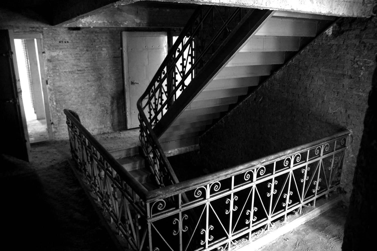 een ijzeren trap naar de eerste verdieping waar nu plaats is voor 25 kilometer archief in plaats van 6 kilometer. We wandelen verder in de ruwbouw. Blijkt dat de vensters nog donker gemaakt moeten worden want vocht, licht en uiteraard vuur zijn grote vijanden van papieren bestanden. Bij de verbouwingen werd dan ook met deze gevaren rekening gehouden voor zo ver dat mogelijk was. Hier en daar blijven nog stukjes over van het oude gebouw. Een trap bijvoorbeeld, een torentje, een plek met een mozaïeken vloer.