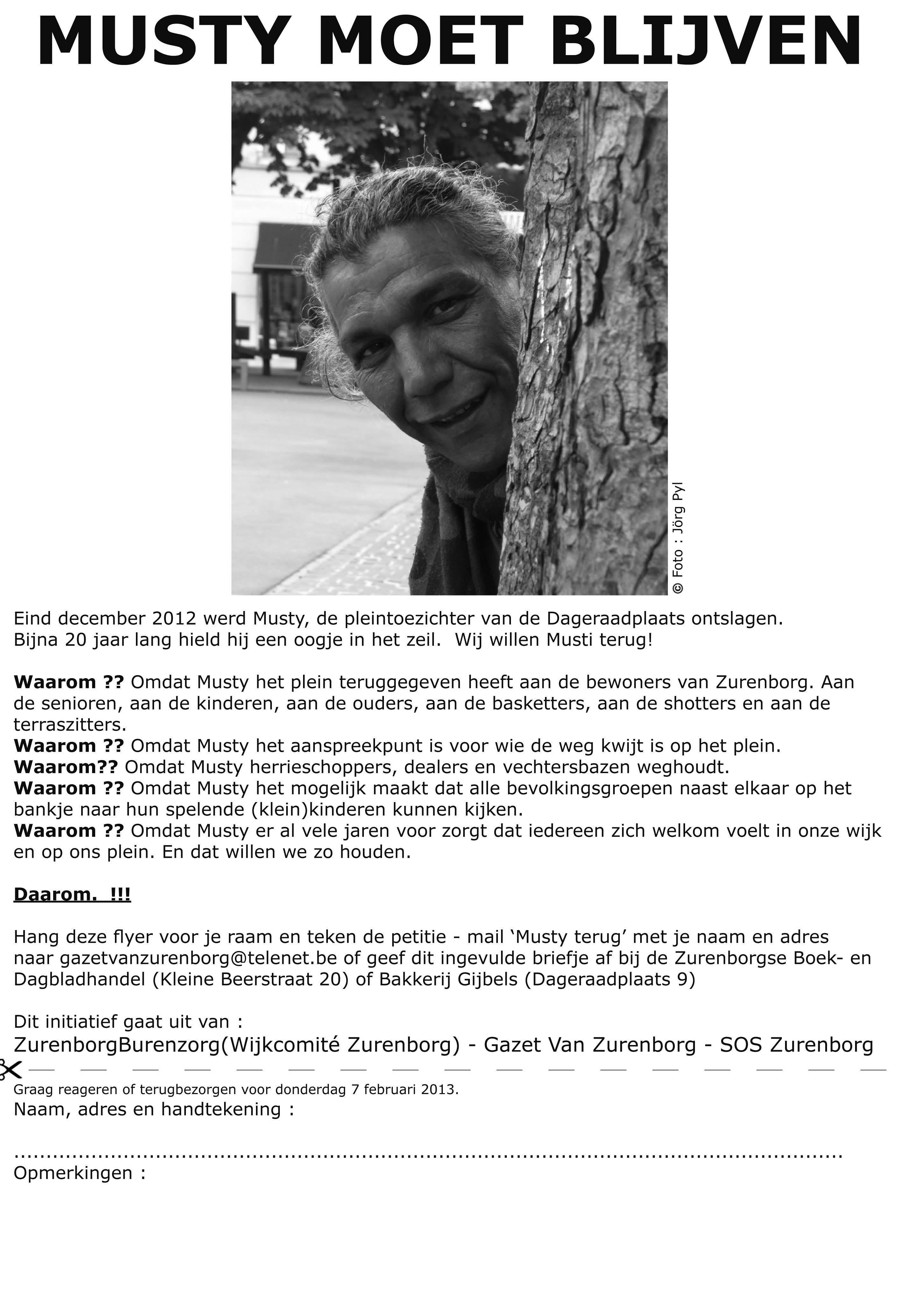 Maar wat nu ? Da’s een goeie vraag en we moeten eerlijk zijn: we weten het niet. Musty zelf zegt dat hij graag wil blijven werken op het plein en om het te bewijzen loopt hij daar nu rond als “vrijwilliger”. Maar dat liedje kan ook niet lang blijven duren. In dit dossier kan alleen de eerlijkheid zegevieren. Mensen die zeggen dat ze de zaak willen herbekijken, dat de beslissing te snel is genomen, zonder enige vorm van communicatie met de wijk en haar bewoners. En ook dit staat in de bestuursakkoorden van zowel het nieuwe als het oude college. Burgers zullen geïnformeerd worden en inspraak is een belangrijk element in de besluitvorming. Wel, misschien moet de lakmoesproef dan uitsluitsel brengen. Een avondje in de zaal van de Zurenborger bvb waar iedereen zijn zegje kan komen doen over Musty en het plein en desnoods eindigt de avond met een fundamenteel gebaar van onze democratie : een stemming. Wie is voor en wie is tegen. En als krant maken we alvast deze belofte: als zo’n avond niet in het budget van de stad past zijn we bereid om met gulle avond deze Democratische Communicatieve Stemavond te nancieren. Met plezier.