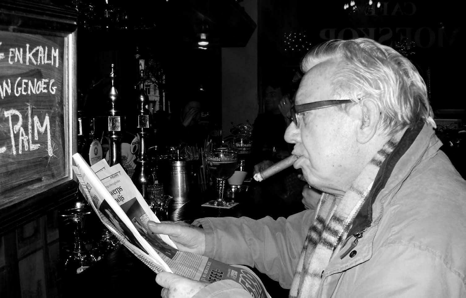 Arthur Kimpen zoals velen hem zich zullen herinneren: dampend sigaartje, krantje bij de hand en ergens gezellig in een Zurenborgs horecabedrijf. (Eigen Foto)