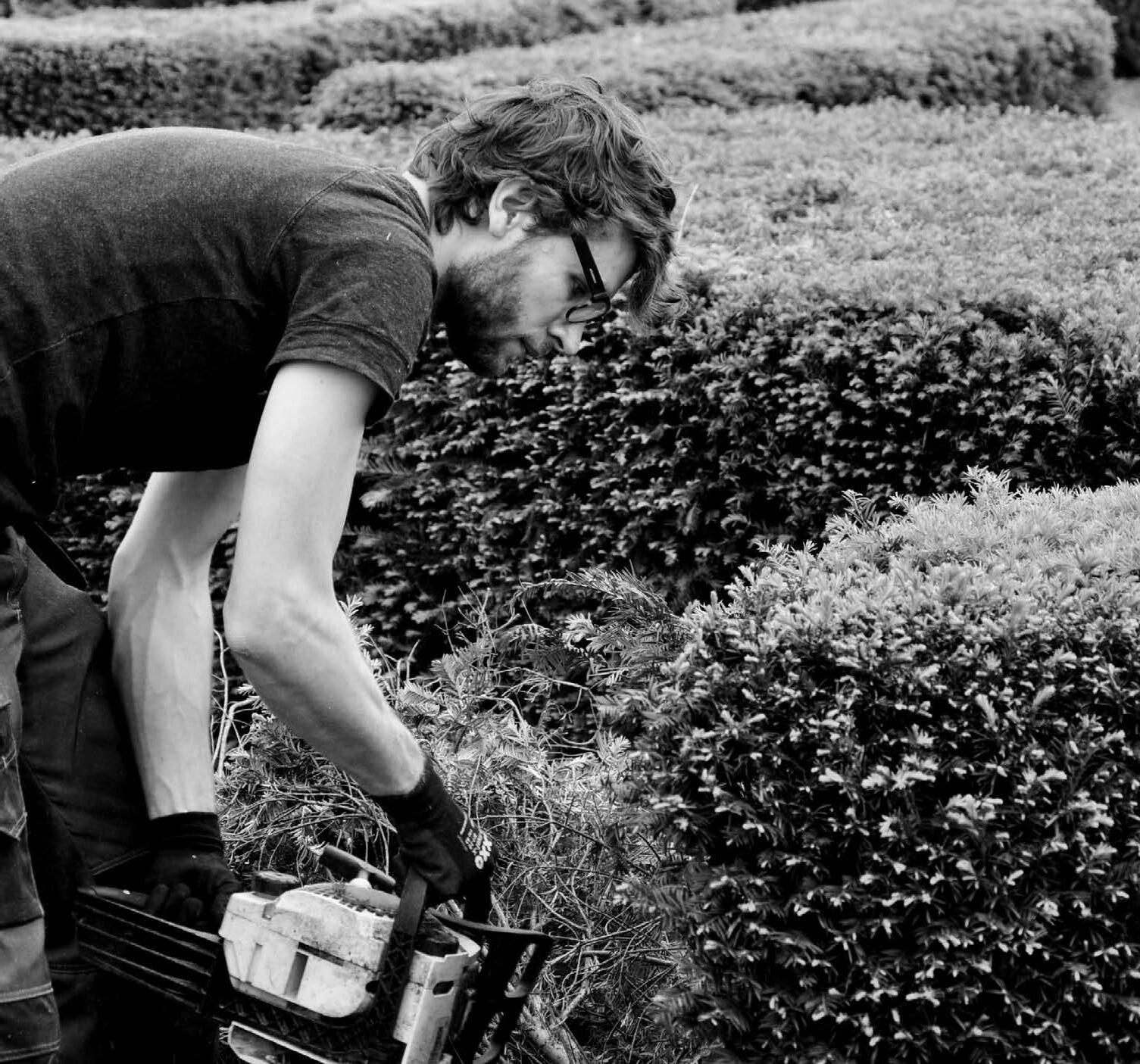 Die woensdagnamiddag heerst er een drukte van jewelste op het plein. Enkele tientallen vrijwilligers en mensen van Kras zijn druk in de weer in het midden van de doolhof enkel buxushagen te rooien. Vooral het verwijderen van de wortelkluit blijft een zware karwei. Maar met een glimlach en een kruiwagen wordt wortelkluit na wortelkluit afgevoerd naar de containers. Het plantseizoen is voorbij voor de taxussen, zij kunnen dus nergens anders geplant worden en verdwijnen daarom in een groencontainer. Even werd gedacht aan de kankerstichting, want taxussen bevatten stoffen die kanker kunnen remmen. Op de plaatsen waar de plantbakken moeten komen, staat voorlopig een tak van een bamboeplant, die later weer zal verdwijnen. De grond boven de parkeergarage is niet diep genoeg voor soortgelijke uit de kluiten gewassen struiken.