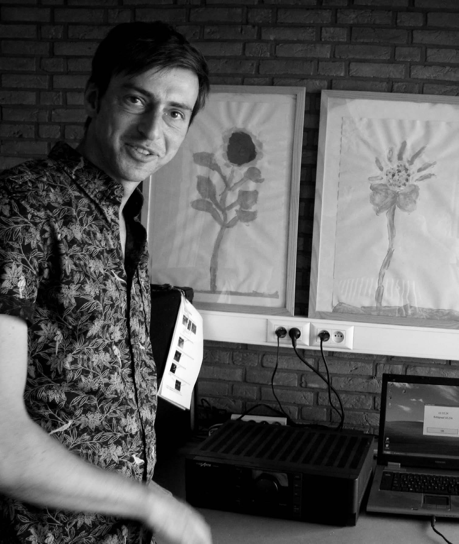 Directeur Koen Dedapper bij zijn laptop en zijn muziekversterker. • Foto Luk DEPONDT