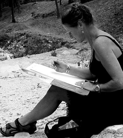 de natuur. Naast de pentekeningen, werkt zij ook met mixed media en olieverf. Met deze techniek beeldt zij zeer gedetailleerd gevels, huizen tot zelfs complete stadsgezichten uit. Toch blijft ook hier de basis vaak pen en inkt. Er is een gelaagdheid en een diepte in haar tekeningen, die haar